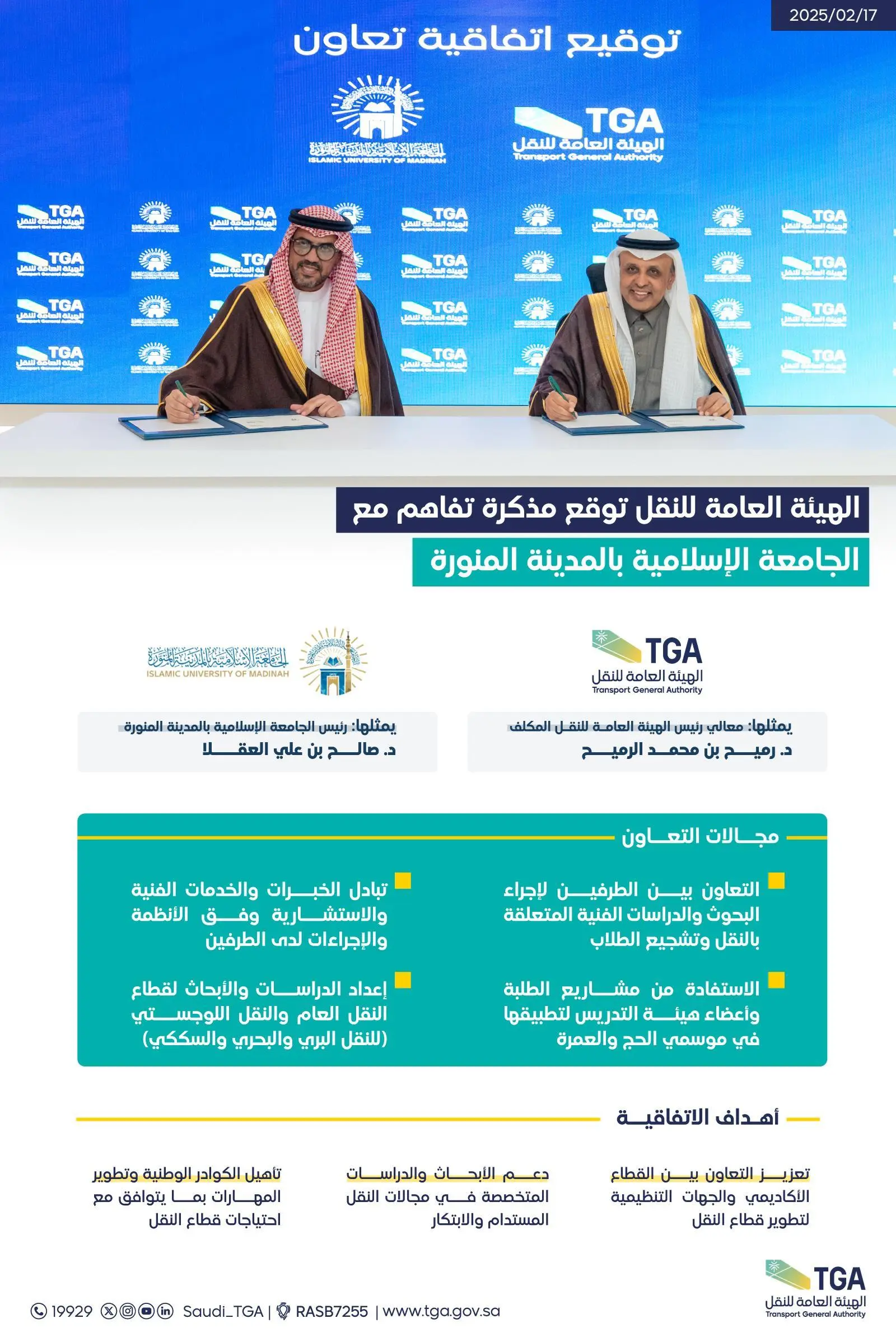 الهيئة العامة للنقل توقّع مذكرة تفاهم مع الجامعة الإسلامية بالمدينة المنورة لتعزيز التعاون الأكاديمي في قطاع النقل