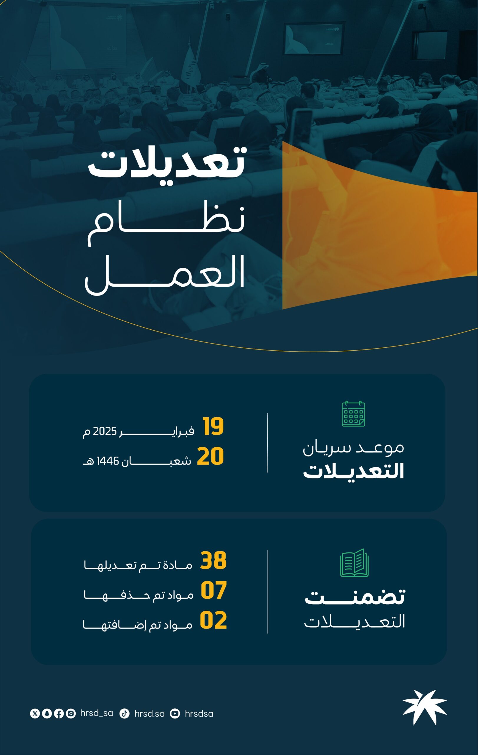 أعلنت وزارة الموارد البشرية والتنمية الاجتماعية عن بدء سريان تعديلات نظام العمل ابتداءً من يوم غدٍ الأربعاء 1446/08/20هـ الموافق 2025/02/19م، وذلك استنادًا إلى قرار مجلس الوزراء بتاريخ 02 /02 /1446هـ، بناءً على المرسوم الملكي بتاريخ 1446/02/08هـ، بهدف تعزيز الاستقرار الوظيفي، ورفع كفاءة سوق العمل لتلبية احتياجات القطاع الخاص.