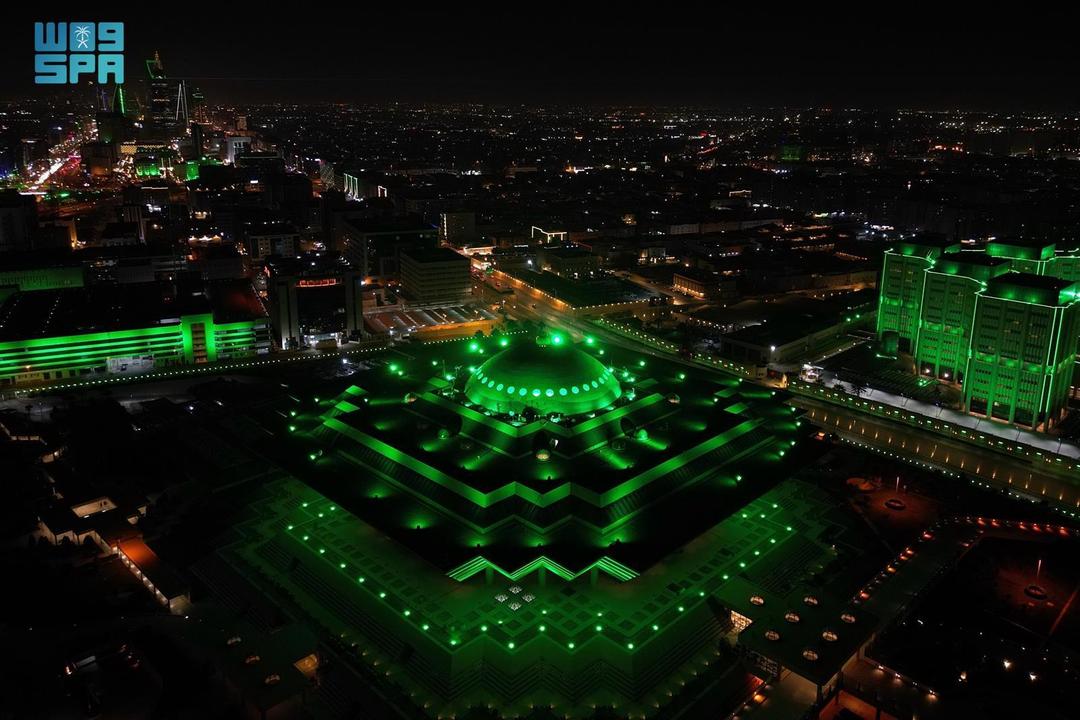 مباني وزارة الداخلية وإمارات المناطق والقطاعات الأمنية تكتسي باللون الأخضر ابتهاجًا بذكرى يوم التأسيس