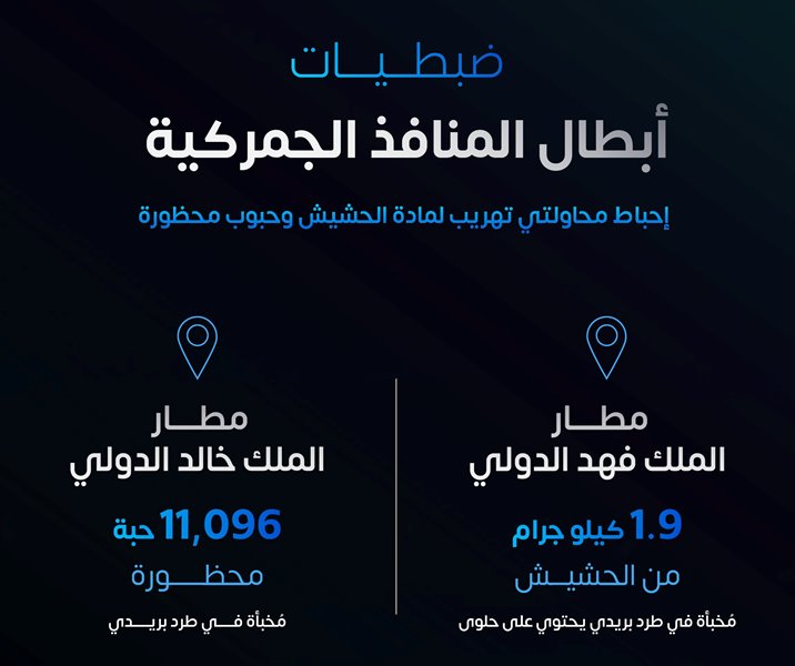 تمكنت هيئة “الزكاة والضريبة والجمارك” في مطار الملك فهد الدولي من إحباط محاولة تهريب 1.9 كيلوجرام من الحشيش، وإحباط محاولة أخرى لتهريب 11,096 حبة محظورة وذلك في مطار الملك خالد الدولي.