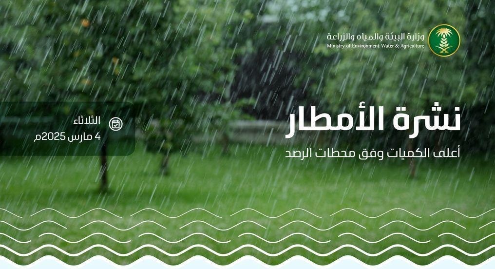 ووفقًا للتقرير اليومي لوزارة البيئة والمياه والزراعة، حول كميات هطول الأمطار في مناطق المملكة كافة؛ سجّلت (18) محطة رصد هيدرولوجي ومناخي، خلال الفترة من الساعة التاسعة صباح الاثنين 3 مارس وحتى التاسعة صباح الثلاثاء 4 مارس 2025م، هطول أمطارٍ في مناطق (الرياض، مكة المكرمة، المدينة المنورة، القصيم، الشرقية، وحائل).