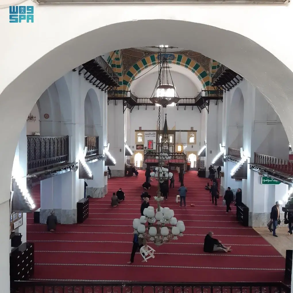 كما يحتوي المسجد على منبرين ومحراب، ويوجد بأعلى المسجد ممر خشبي يحيط بالمسجد ويستعمل لطلاء جدران المسجد وتنظيف سقفه، وتوجد به نوافذ صغيرة مصنوعة من الرخام الأبيض تستعمل لإضاءة المكان إضافة إلى أن إطارات الأبواب كلها من الرخام الإيطالي الأبيض.