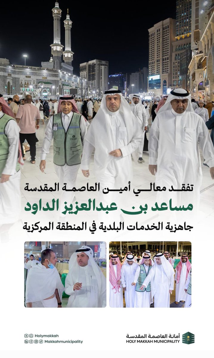 تفقد معالي أمين العاصمة المقدسة، مساعد بن عبدالعزيز الداود، اليوم برفقة عدد من المسؤولين في الأمانة المنطقة المركزية حول المسجد الحرام، لمتابعة سير العمل في المشاريع الحيوية والتأكد من تنفيذ الخطط التطويرية الهادفة إلى تحسين الخدمات المقدمة للزوار والمعتمرين والسكان، خلال موسم رمضان 1446هـ.