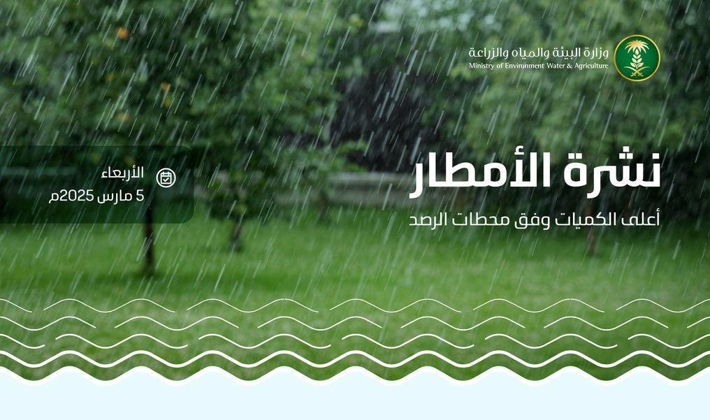 ووفقًا للتقرير اليومي لوزارة البيئة والمياه والزراعة، حول كميات هطول الأمطار في مناطق المملكة كافة؛ سجّلت (81) محطة رصد هيدرولوجي ومناخي، خلال الفترة من الساعة التاسعة صباح الثلاثاء 4 مارس وحتى التاسعة صباح الأربعاء 5 مارس 2025م، هطول أمطارٍ في مناطق (الرياض، ومكة المكرمة، والمدينة المنورة، والقصيم، والشرقية، وحائل، والحدود الشمالية، والباحة).