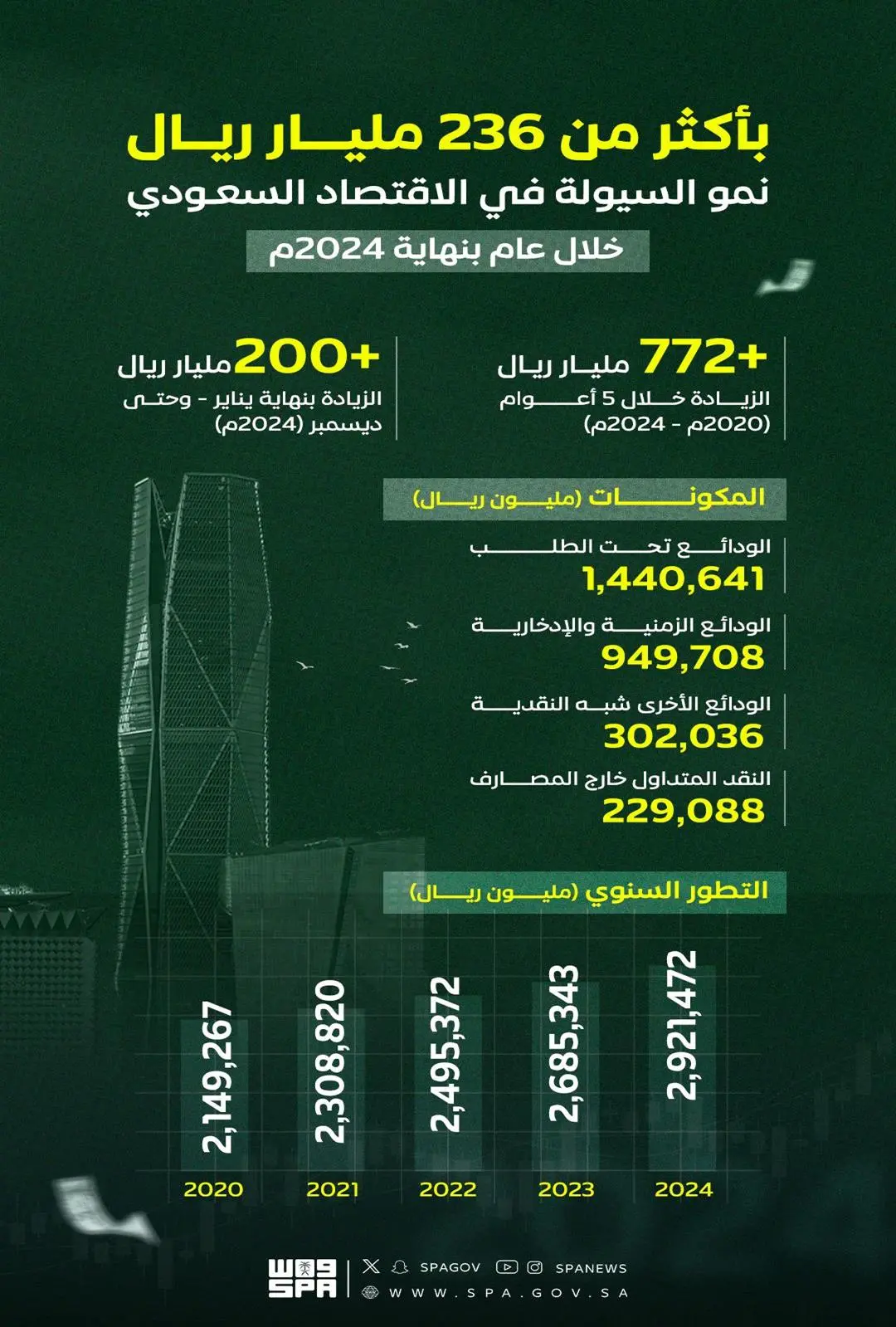 السيولة في الاقتصاد السعودي تنمو خلال عام بأكثر من 236 مليار ريال بنهاية 2024م
