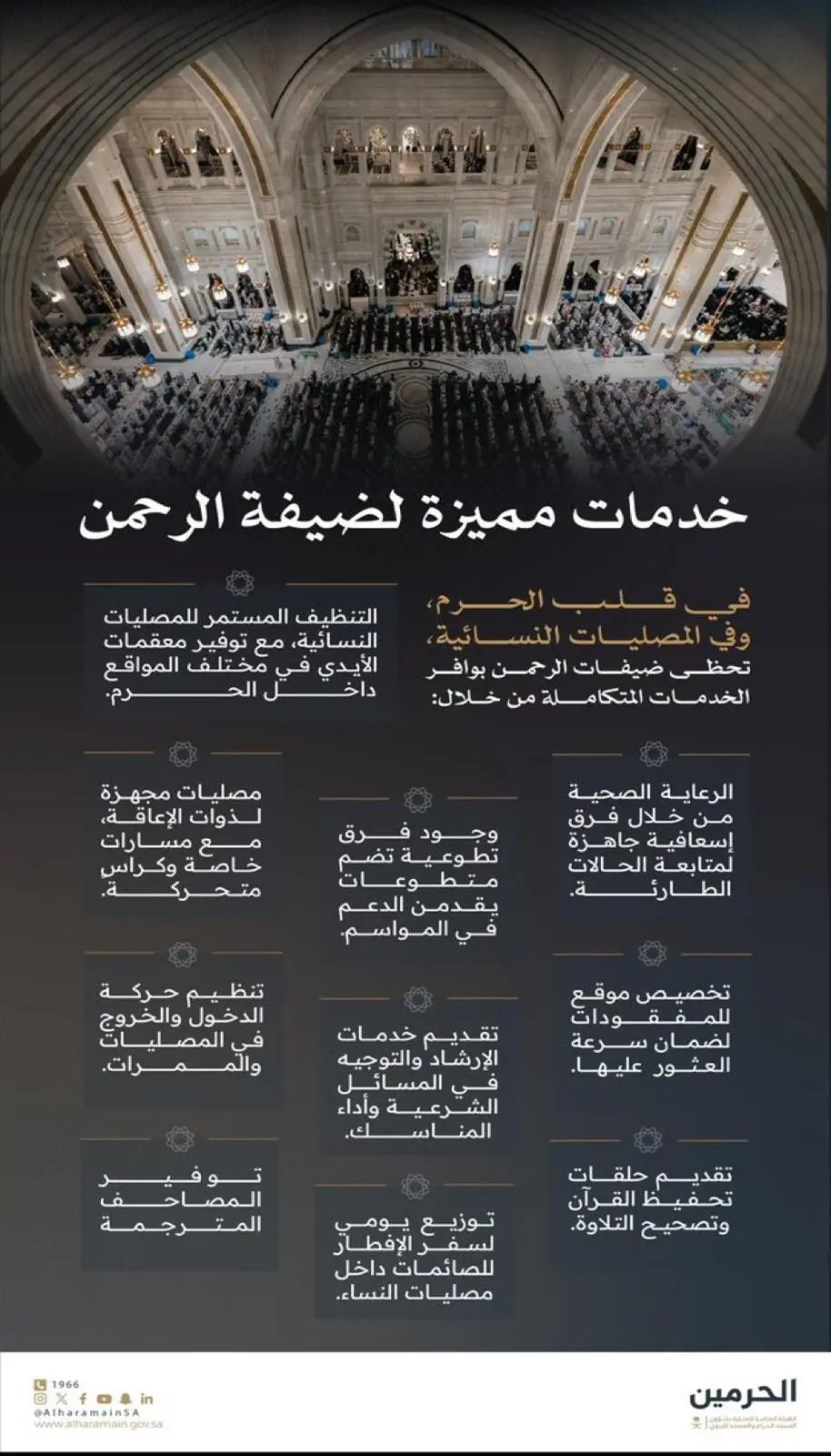ووفرت الهيئة خدمات متكاملة داخل تلك المصليات مثل الرعاية الصحية من خلال الفرق الإسعافية الجاهزة لمتابعة الحالات الطارئة، وتخصيص موقع للمفقودات ومواد لضمان سرعة العثور عليها، وتقديم حلقات تحفيظ القرآن وتصحيح التلاوة، وتوزيع يومي لسُفَر الإفطار للصائمات داخل مصليات النساء، وتوفير المصاحف المترجمة, إضافة إلى خدمات الإرشاد والتوجيه في المسائل الشرعية وأداء المناسك، وتنظيم حركة الدخول والخروج في المصليات والممرات ومصليات مجهزة لذوات الإعاقة مع مسارات خاصة وكراسي متحركة.