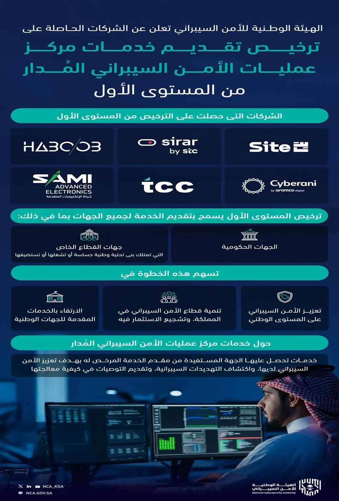وأوضحت الهيئة أن الشركات التي حصلت على الترخيص من المستوى الأول هي: الشركة السعودية لتقنية المعلومات (سايت)، وشركة المتقدمة للتقنية والأمن السيبراني المحدودة (سرار)، وشركة هبوب التقنية للاتصالات وتقنية المعلومات، وشركة حلول الشرق الأوسط لتقنية المعلومات (سيبراني)، وشركة تحكم التقنية المحدودة، وشركة الإلكترونيات المتقدمة المحدودة، وسيخول الترخيص مقدم الخدمة تقديم مجموعة من الخدمات؛ بهدف تعزيز الأمن السيبراني في الجهة المستفيدة، واكتشاف التهديدات السيبرانية، وتقديم التوصيات في كيفية معالجتها.