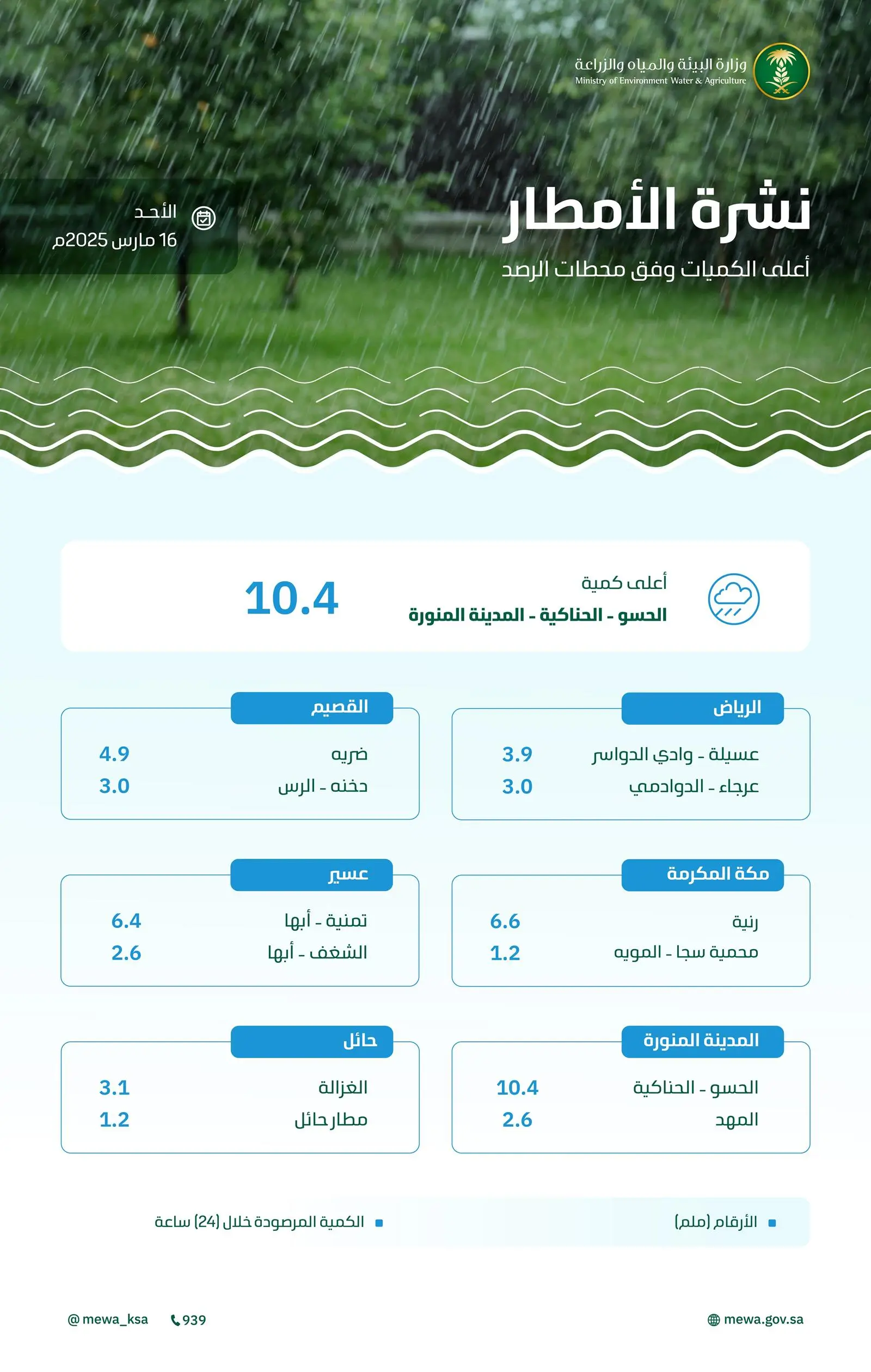 سجّلت منطقة المدينة المنورة أعلى معدل لكميات هطول الأمطار بـ (10.4) ملم في الحسو بمحافظة الحناكية، ضمن (7) مناطق في المملكة شهدت كميات متفرقة من الأمطار، فيما سجّلت محافظة المهد (2.6) ملم، ومطار المدينة (2.2) ملم، وحي المطار بالمدينة (2.0) ملم، والحناكية (1.2) ملم.