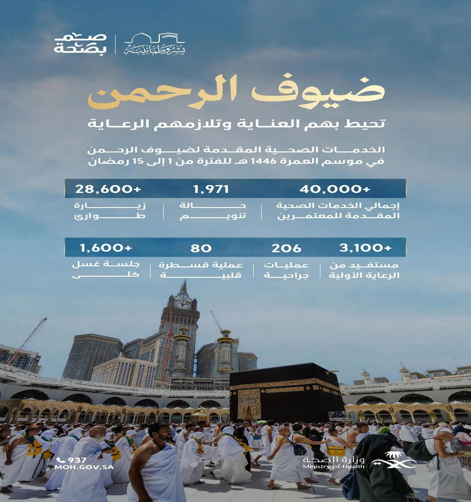 وشملت الخدمات المقدمة رعاية صحية شاملة، حيث استقبلت المستشفيات أكثر من 1900 حالة تنويم، وتعاملت مع أكثر من 28 ألف حالة طوارئ, وقُدمت الرعاية الصحية الأولية لأكثر من 3 آلاف معتمر، وأجريت أكثر من 200 عملية جراحية، بما في ذلك 80 عملية قسطرة قلبية، وأكثر من 1,600 جلسة غسيل كلى, وتعكس هذه الأرقام استعداد الفرق الطبية لتلبية مختلف الاحتياجات الصحية للمعتمرين بكفاءة واحترافية.