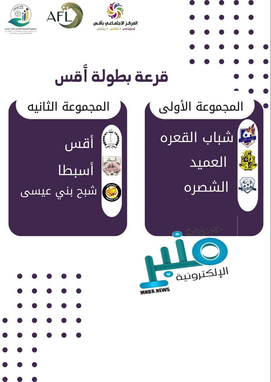 وتضم الدورة فرق: العميد، شباب القعرة، أقس، شبح بني عيسى، مقسمة على مجموعتين، حيث تقام جميع المباريات على ملعب المركز الاجتماعي بوادي أقس.