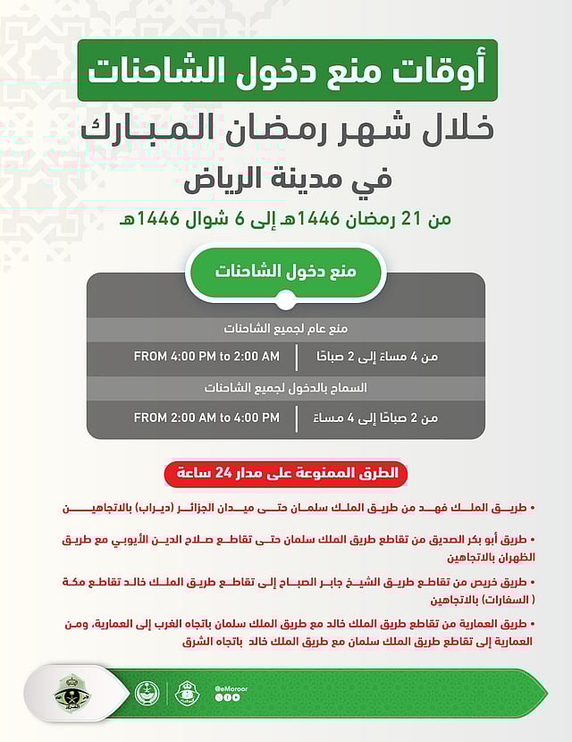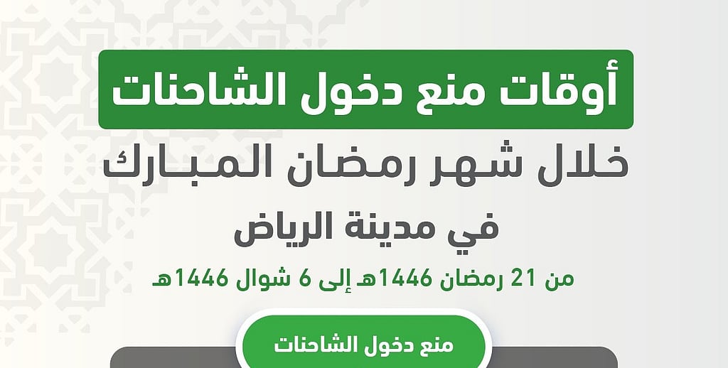أعلنت الإدارة العامة للمرور، تنظيم دخول الشاحنات إلى مدينة الرياض خلال شهر رمضان المبارك، بدءاً من 21 رمضان 1446هـ حتى 6 شوال 1446هـ