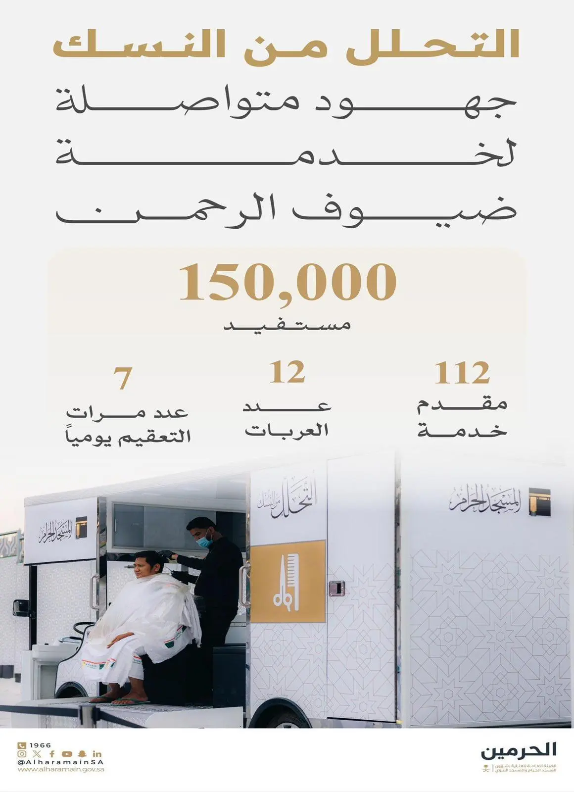 وأوضحت الهيئة العامة للعناية بشؤون المسجد الحرام والمسجد النبوي, أن عدد المستفيدين من خدمة التحلل من النسك منذ بداية شهر رمضان بلغ (150) ألف مستفيد عن طريق (112) مقدم خدمة و (12) عربة مجهزة بأدوات التعقيم وآمنة لضمان أقصى درجات الراحة والأمان مع سهولة التنقل خلال أوقات الازدحام؛ مما يسهّل على ضيوف الرحمن أداء مناسكهم بكل يسر وسهولة.