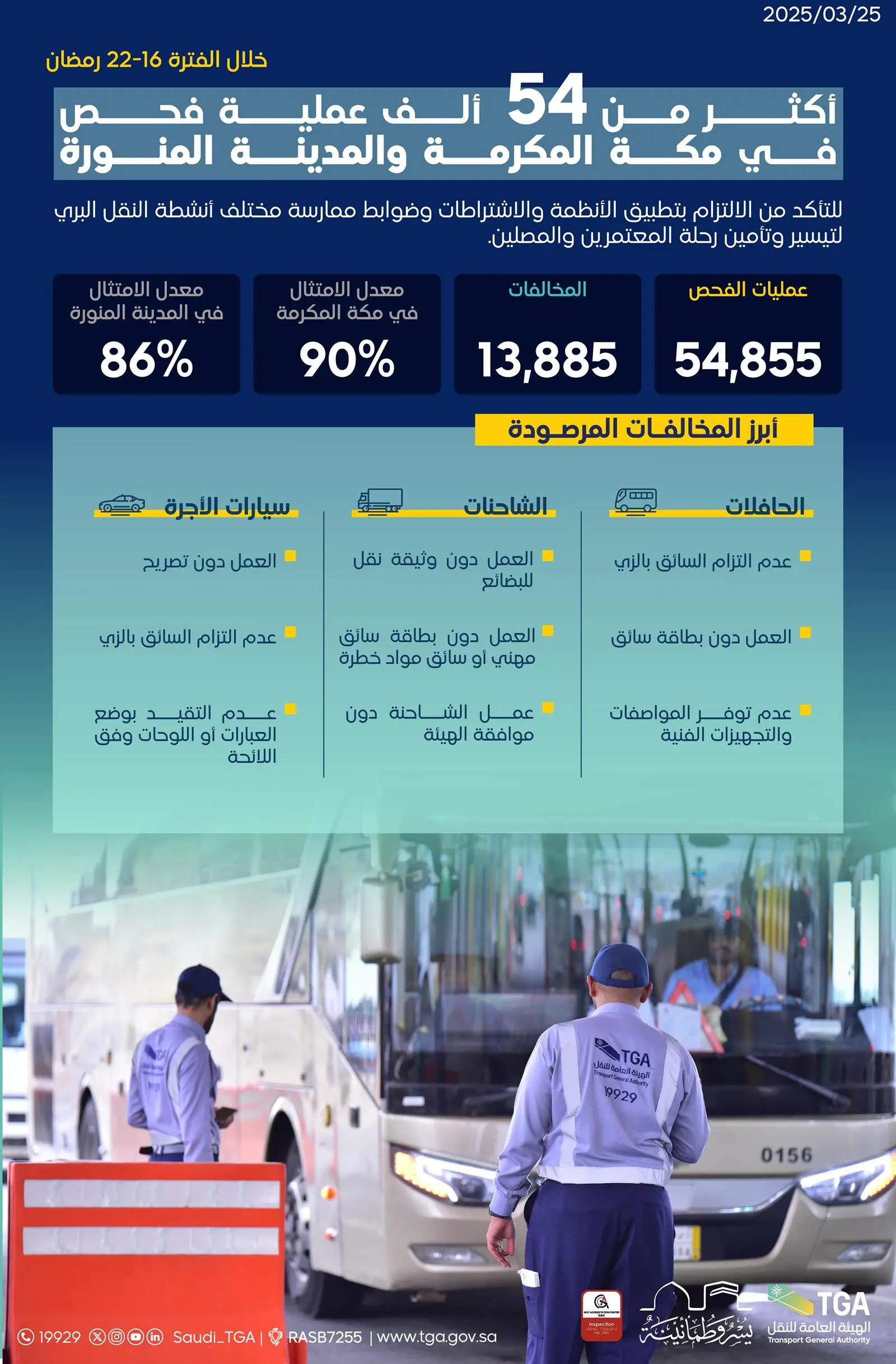 “هيئة النقل” تنفذ أكثر من 54 ألف عملية فحص على أنشطة النقل في مكة المكرمة والمدينة المنورة خلال الأسبوع الثالث من شهر رمضان
