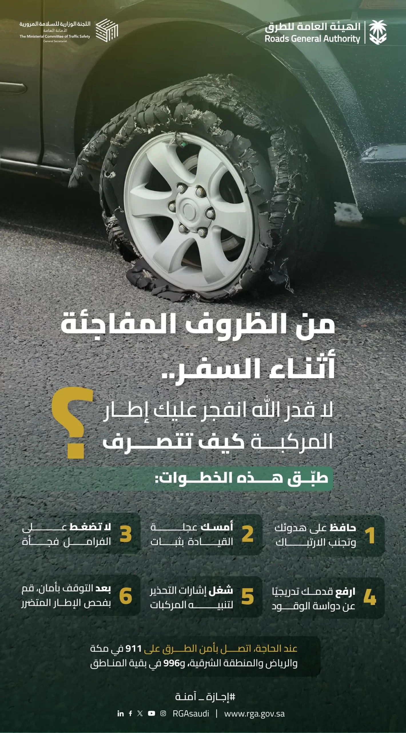 نصحت الهيئة العامة للطرق قائدي المركبات باتباع مجموعة من الخطوات المهمة في حال انفجار إطار المركبة -لا قدر الله-، وذلك في إطار الحملة التي أطلقتها تحت عنوان “إجازة آمنة”، بالتعاون مع اللجنة الوزارية للسلامة المرورية، التي تهدف إلى حث مستخدمي الطرق على الالتزام بإرشادات السلامة قبل السفر بين مدن المملكة خلال إجازة عيد الفطر المبارك، لضمان سلامة الجميع على الطرق.