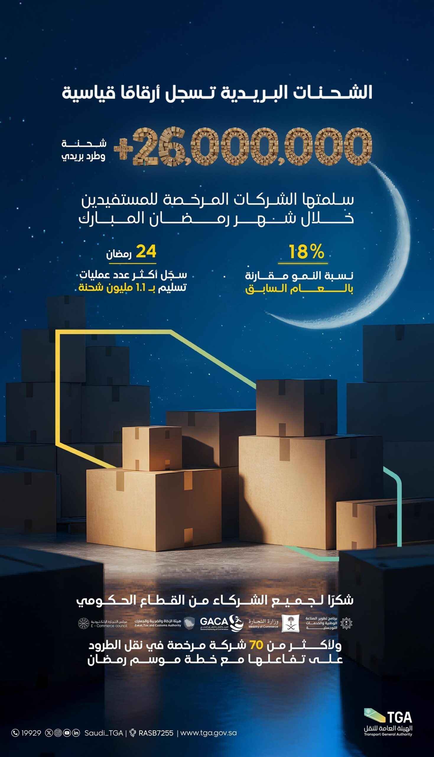 أعلنت الهيئة العامة للنقل عن تسليم الشركات المرخصة في نقل الطرود أكثر من 26 مليون شحنة وطرد بريدي خلال شهر رمضان لعام 1446هـ، مسجلًا بذلك نسبة نمو بلغت نسبته 18% مقارنة بالفترة نفسها من العام الماضي.