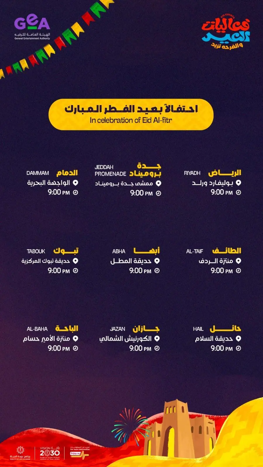 تنطلق غدًا، أول أيام عيد الفطر ، عروض الألعاب النارية في مختلف مناطق المملكة عند الساعة التاسعة مساءً، بتنظيم من الهيئة العامة للترفيه (GEA)، ضمن حملة فعاليات العيد 2025، لتملأ سماء المدن بألوان الفرح والبهجة، وتضفي أجواءً احتفالية مميزة تواكب هذه المناسبة السعيدة.