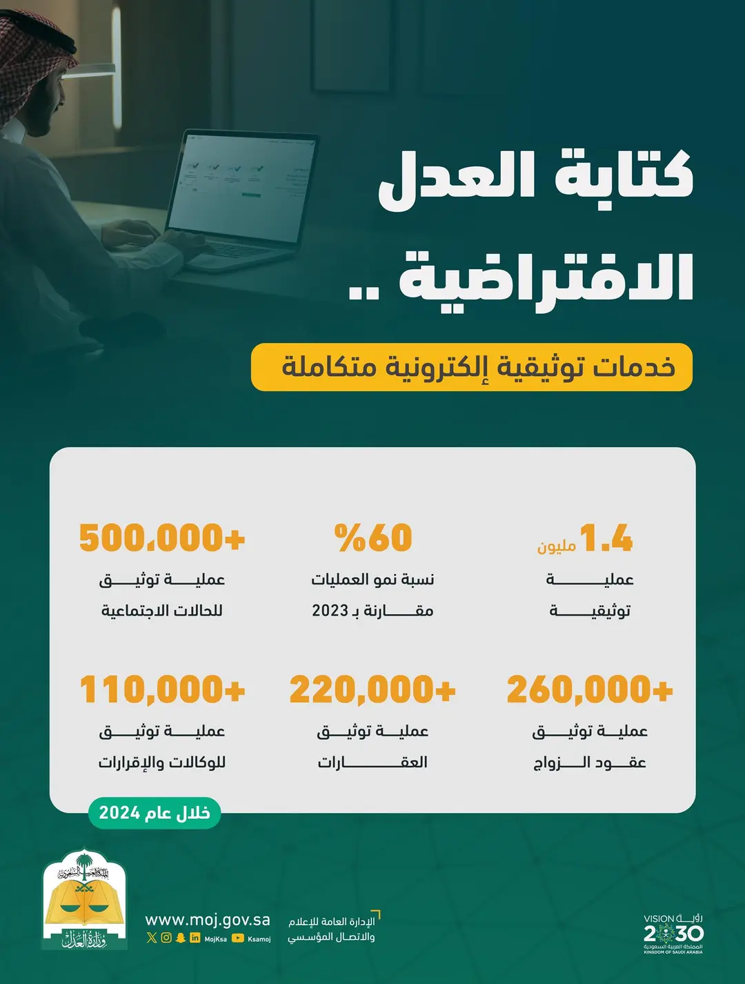 نفذت كتابة العدل الافتراضية أكثر من 1.4 مليون عملية توثيقية خلال العام الماضي 2024م، وذلك عبر منصة الخدمات الإلكترونية لوزارة العدل “ناجز”.