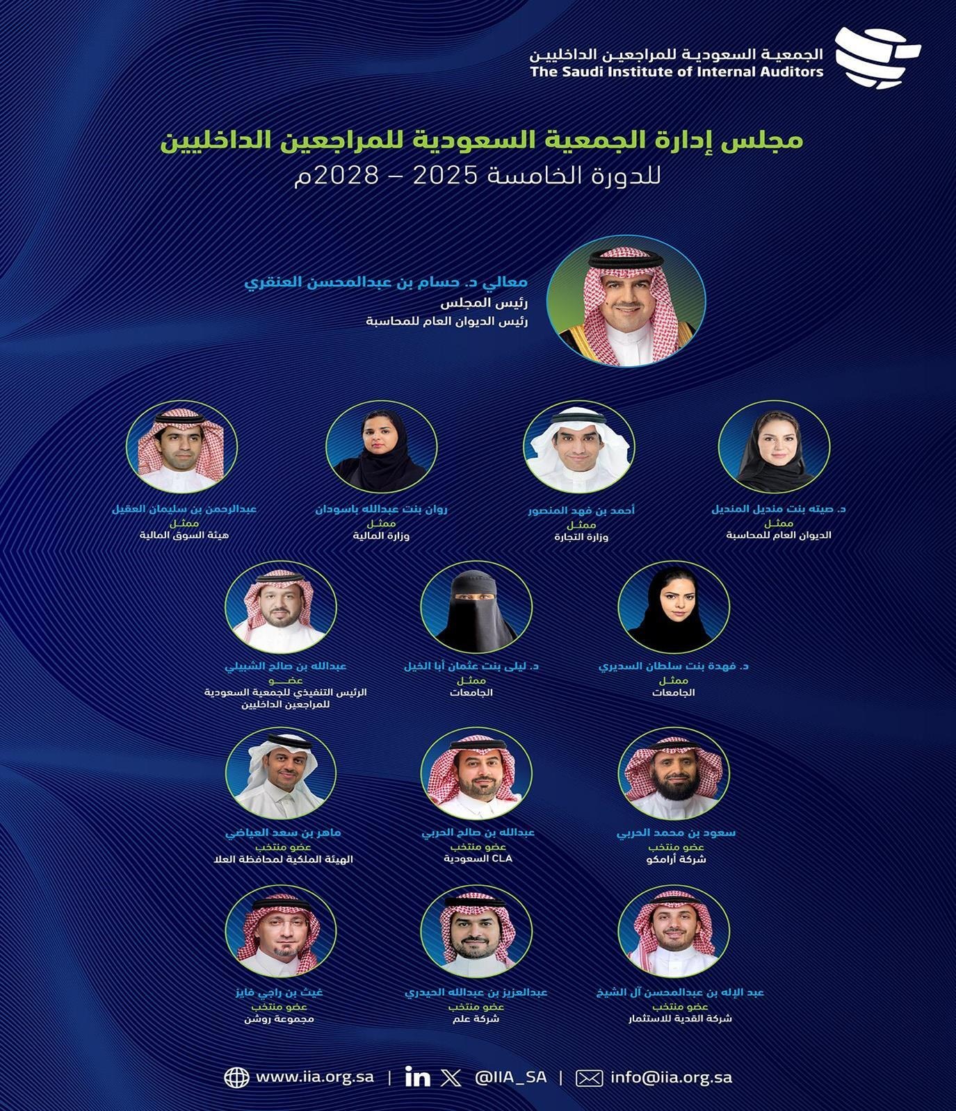 اعتمد معالي رئيس الديوان العام للمحاسبة رئيس مجلس إدارة الجمعية السعودية للمراجعين الداخليين الدكتور حسام بن عبدالمحسن العنقري، تشكيل مجلس إدارة الجمعية السعودية للمراجعين الداخليين للدورة الخامسة 2025 – 2028م، وذلك بعد نجاح الانتخابات التي أُجريت في نهاية شهر فبراير الماضي، حيث مثّلت العملية الانتخابية محطة مهمة في تعزيز الحوكمة والمشاركة الفاعلة لأعضاء الجمعية في تشكيل المجلس الإداري.