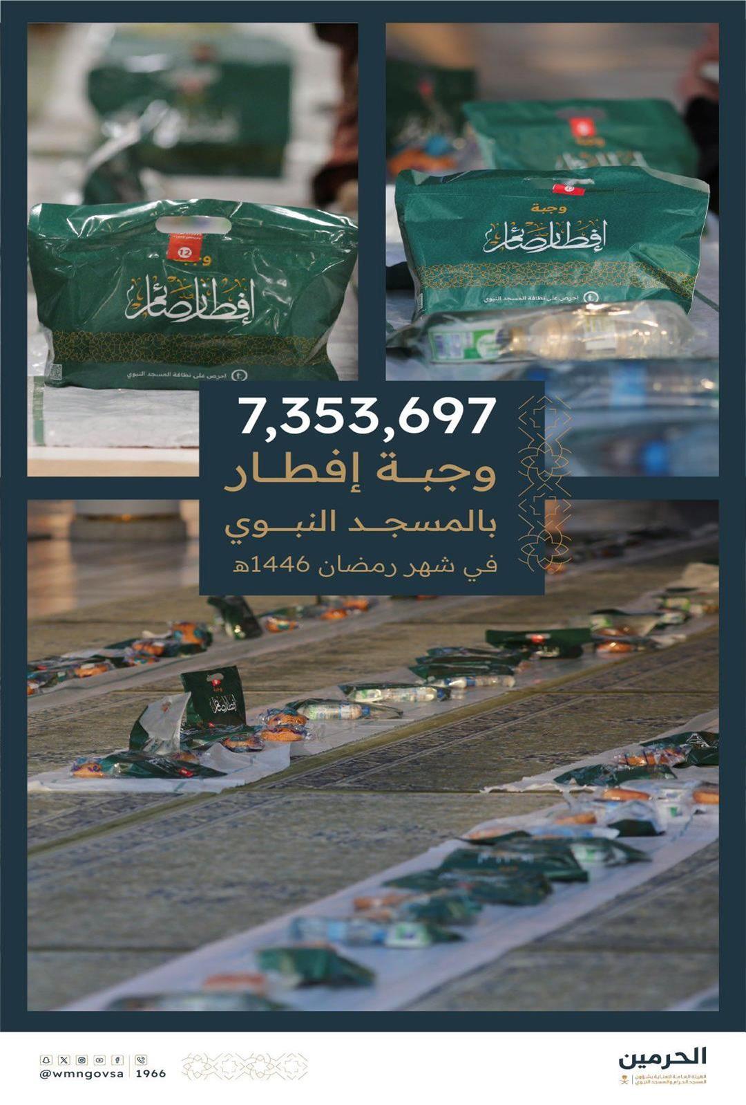 قدمت الهيئة العامة للعناية بشؤون المسجد الحرام والمسجد النبوي 7.343.697 وجبة إفطار صائم في المسجد النبوي خلال شهر رمضان المبارك لهذا العام.