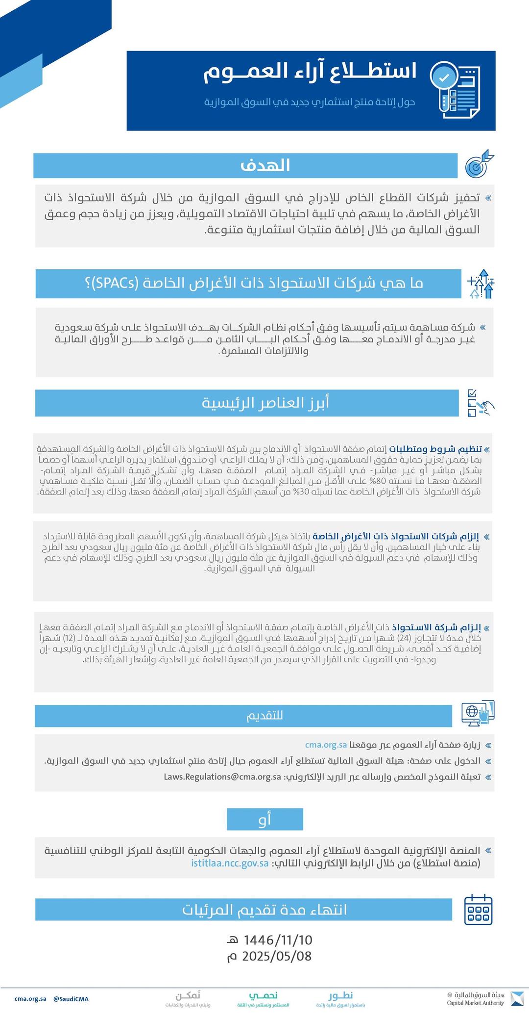دعت هيئة السوق المالية عموم المهتمين والمعنيين والمشاركين في السوق المالية لإبداء مرئياتهم حيال إتاحة منتج استثماري جديد في السوق الموازية يتمثل في طرح شركة الاستحواذ ذات الأغراض الخاصة (SPACs)، التي من شأنها أن تؤثر بشكل إيجابي في زيادة مستويات السيولة من خلال زيادة عدد الطروحات، وذلك لمدة 30 يومًا تقويميًا تنتهي بتاريخ 10 / 11 / 1446هـ الموافق 08 / 05 / 2025م.