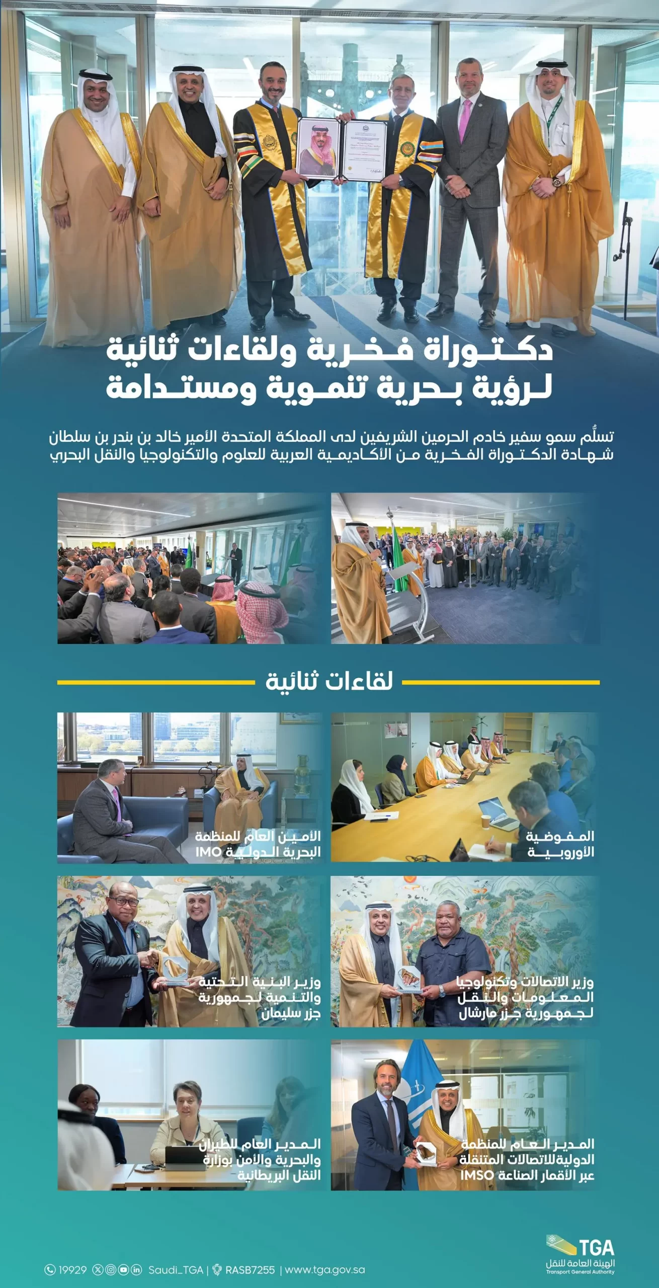 وجاءت زيارة معالي الدكتور الرميح تزامنًا مع مناسبة تسلّم صاحب السمو الملكي الأمير خالد بن بندر بن سلطان بن عبدالعزيز سفير خادم الحرمين الشريفين لدى المملكة المتحدة، ورئيس الدورة الـ33 للجمعية العمومية للمنظمة البحرية الدولية، شهادة الدكتوراة الفخرية من الأكاديمية العربية للعلوم والتكنولوجيا والنقل البحري، نظير إسهاماته البارزة في دعم التعاون الدولي مع المنظمة البحرية الدولية (IMO)، ودوره الفاعل في تعزيز مكانة الدول العربية ضمن قطاع النقل البحري العالمي.