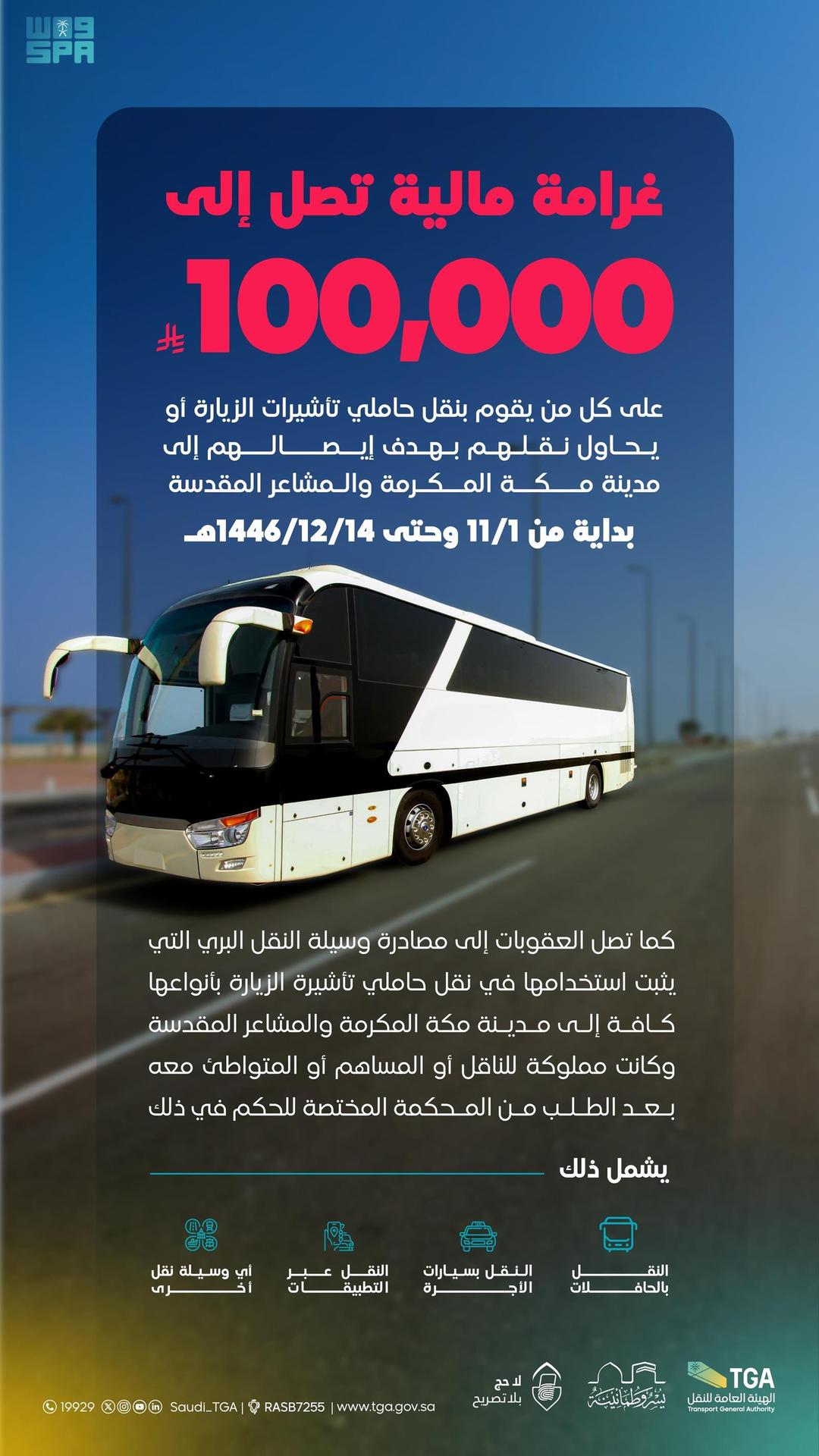 ويأتي هذا التوجيه في إطار تكامل الجهود الوطنية، وتنفيذًا لما أعلنته وزارة الداخلية من ضوابط وتعليمات تهدف إلى تنظيم حركة الحشود، والحفاظ على أمن وسلامة ضيوف الرحمن، التي تتضمن تطبيق عقوبات بحق المخالفين، وغرامة مالية تصل إلى (100,000) ريال على كل من يقوم بنقل حاملي تأشيرات الزيارة أو يحاول نقلهم بهدف إيصالهم إلى مدينة مكة المكرمة والمشاعر المقدسة بداية من 1 ذي القعدة 1446هـ وحتى نهاية يوم 14 من ذي الحجة 1446هـ، وتصل العقوبات إلى مصادرة وسيلة النقل البري التي يثبت استخدامها في نقل حاملي تأشيرة الزيارة بأنواعها كافة إلى مدينة مكة المكرمة والمشاعر المقدسة، وكانت هذه الوسيلة مملوكة للناقل أو المساهم أو المتواطئ معه، بعد الطلب من المحكمة المختصة للحكم في ذلك.