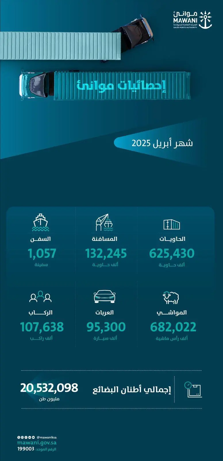 حققت الموانئ التي تشرف عليها الهيئة العامة للموانئ (موانئ) خلال شهر أبريل لعام 2025م ارتفاعًا في أعداد الحاويات المناولة بنسبة 13.43% لتصل إلى 625,430 حاوية قياسية، مقارنة بـ 551,373 حاوية قياسية بالفترة المماثلة من العام الماضي 2024م، وسجلت حاويات المسافنة ارتفاعًا بنسبة 7.46% لتصل إلى 132,245 حاوية، مقارنة بـ 123,060 حاوية العام الماضي.