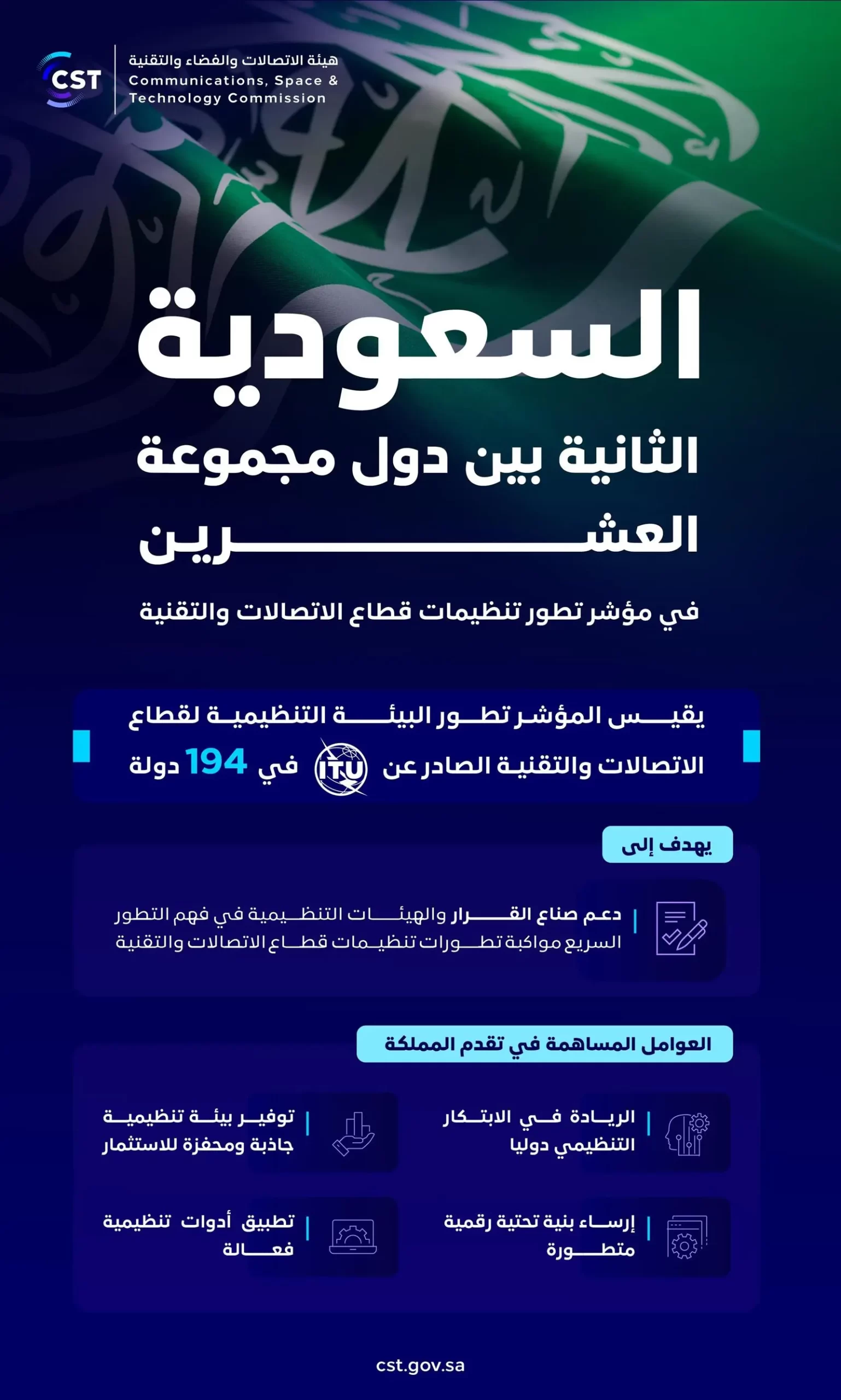 المملكة تحقق المركز الثاني على دول مجموعة العشرين في مؤشر تطور تنظيمات قطاع الاتصالات والتقنية الصادر عن الاتحاد الدولي للاتصالات