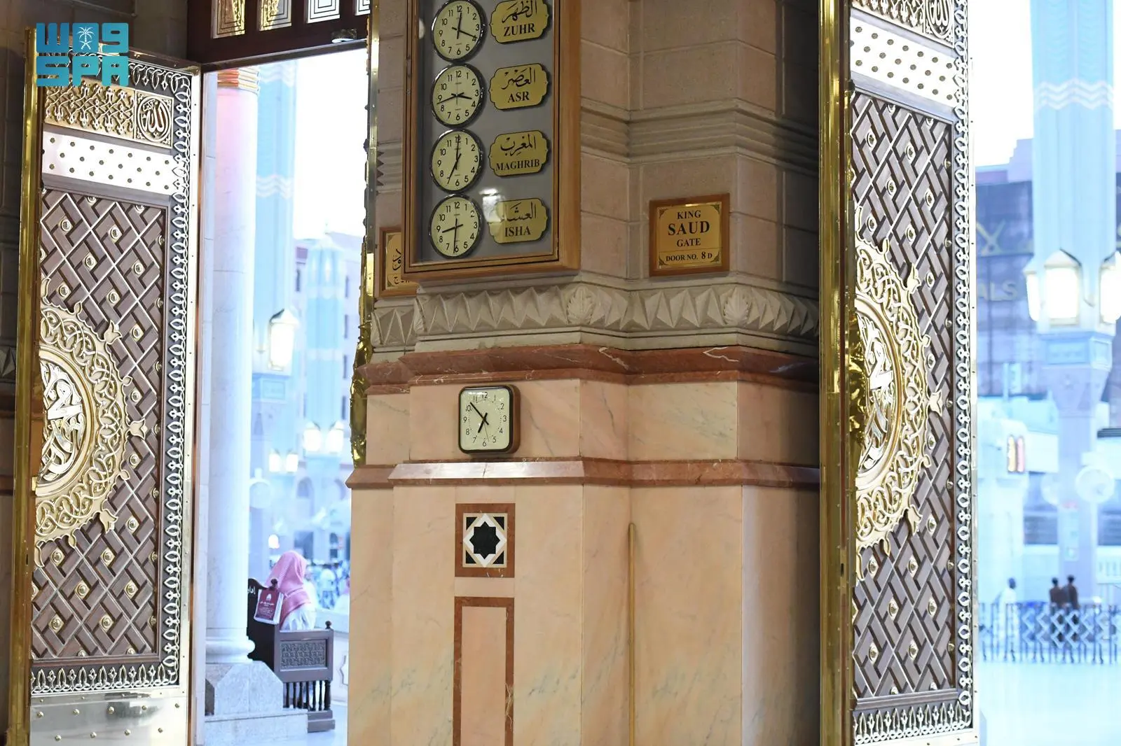وتبرز من هذه المعالم أبواب المسجد التي تمثل هوية خاصة لمسجد الحبيب المصطفى -صلى الله عليه وسلم-، التي يبلغ عددها اليوم مئة باب موزعة بشكل متناسق حول المسجد من جهاته الأربع وتوسعاته وسطحه، يعمل بها 280 موظفًا على مدار الساعات الـ 24 خلال شهر رمضان.