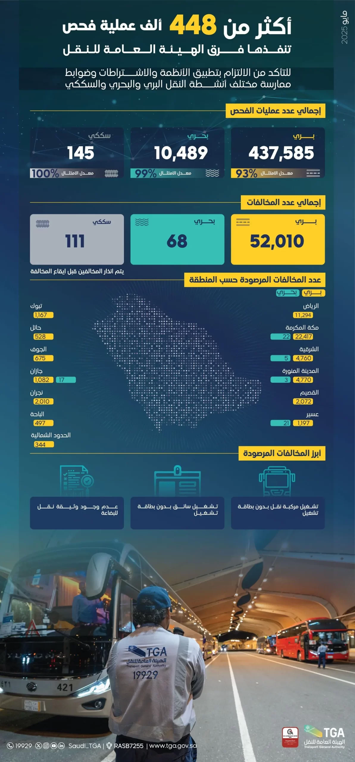 أجرت الهيئة العامة للنقل والمتمثلة بالفرق الرقابية أكثر (480) ألف عملية فحص ميدانية خلال شهر مايو 2025م في أنشطة النقل البري والبحري والسككي، بالتعاون مع عدد من الجهات المعنية، أسفرت عن رصد (52) ألفًا و(189) مخالفة في مختلف مدن ومناطق المملكة.