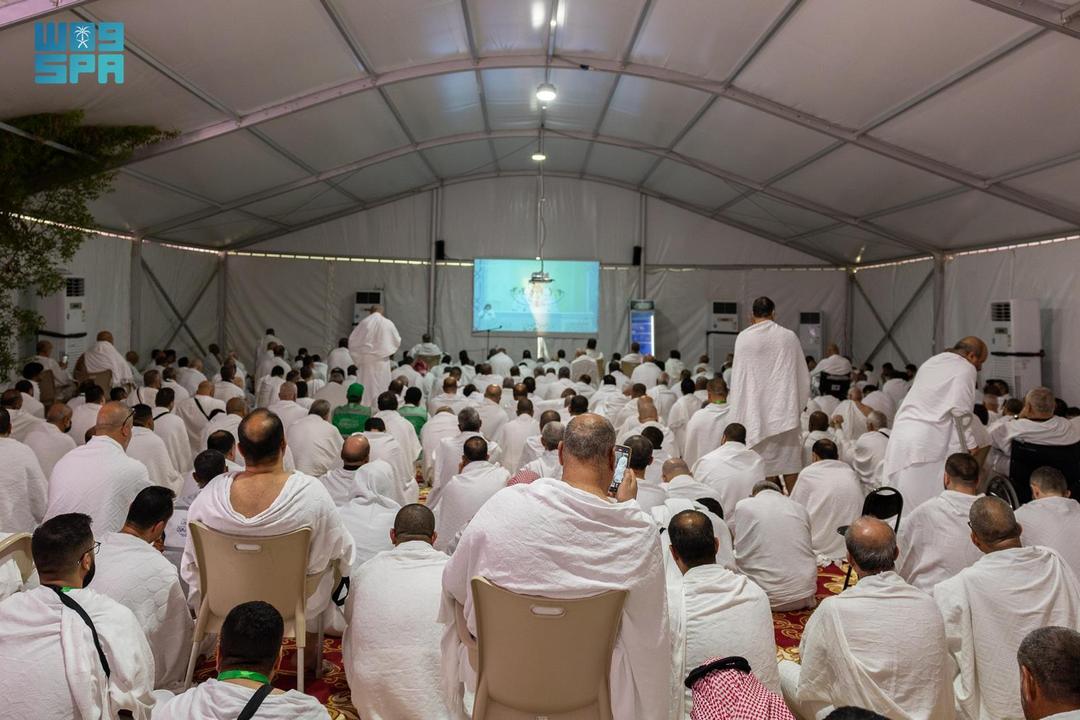 وأدى حجاج بيت الله من ضيوف البرنامج صلاتي الظهر والعصر جمعًا وقصرًا في مخيمهم، بعد أن استمعوا إلى الخطبة وسط أجواء من الطمأنينة والسكينة.