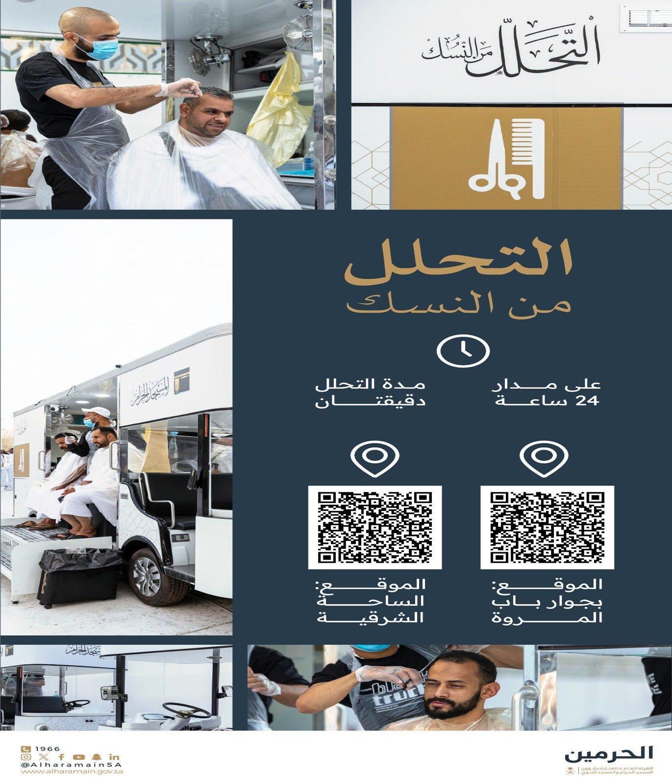 وتمكن الخدمة حجاج بيت الله الحرام من التحلل من النسك ‘قص الشعر’، عبر موقعين، الأول بجوار باب المروة، والثاني في الساحة الشرقية، حيث يستغرق تقديم الخدمة دقيقتين لك حاج.