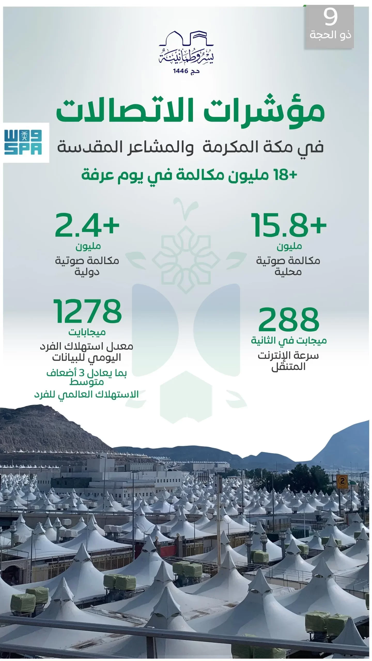 كشفت هيئة الاتصالات والفضاء والتقنية اليوم عن أداء شبكات الاتصالات بمكة المكرمة والمشاعر المقدسة ليوم عرفة التاسع من ذي الحجة 1446هـ، حيث بلغ إجمالي عدد المكالمات (18.3) مليون مكالمة، منها (15.9) مليون مكالمة محلية، و(2.4) مليون مكالمة دولية.