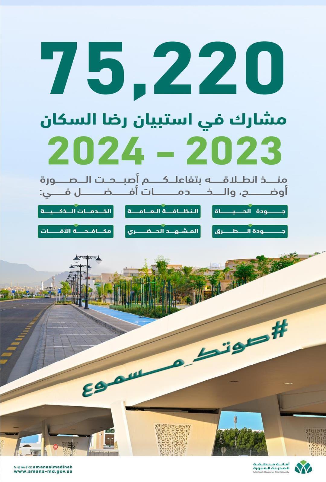 وضم الاستبيان مشاركة أكثر من 75,220 مواطنًا ومقيمًا، فيما أظهرت النتائج مؤشرات إيجابية في مختلف محاور الخدمات، حيث سجل مؤشر رضا السكان عن جودة الحياة ارتفاعًا بنسبة 82%، بزيادة 16% عن الدورة السابقة من الاستبيان، وشمل ذلك تطوير الحدائق والميادين وتوسعة المسطحات الخضراء، فيما بلغت نسبة رضا السكان عن المشهد الحضري 78% بزيادة 18%، في ظل تنفيذ مشاريع نوعية شملت الإضاءة الذكية، والمسارات الآمنة، والمساحات الخضراء، والواجهات الحضرية المحسّنة, كما ارتفع مؤشر رضا السكان عن جودة الطرق إلى 62% بزيادة 27%، بفضل مشاريع التطوير والتحسين في تصميم الطرق وإنارتها.