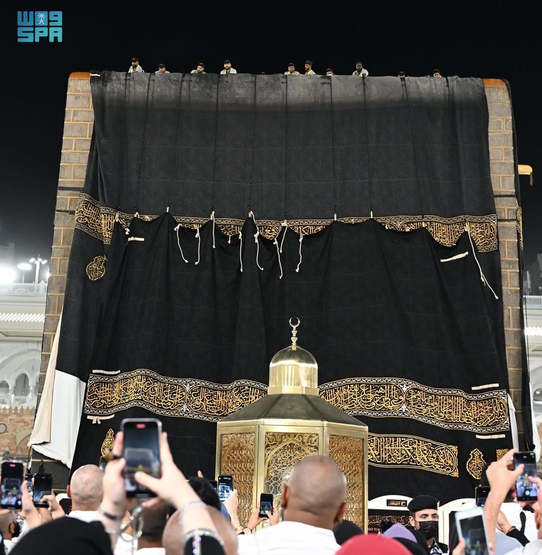 قامت الهيئة العامة للعناية بشؤون المسجد الحرام والمسجد النبوي اليوم، بتغيير كسوة الكعبة المشرفة، كما جرت العادة السنوية، في إرث متواصل من العناية يمتد لـ 100 عام، وذلك من خلال فريق عمل من مجمع الملك عبدالعزيز لكسوة الكعبة المشرفة يبلغ عدده (154) من الكوادر الوطنية يقومون بتنفيذ عملية التغيير، وموزعين على جوانب وسطح الكعبة المشرفة حسب الاختصاص، وبدأ الفريق بتفكيك الكسوة القديمة وتركيب الجديدة، ثم تثبيتها في أركان الكعبة وسطحها.