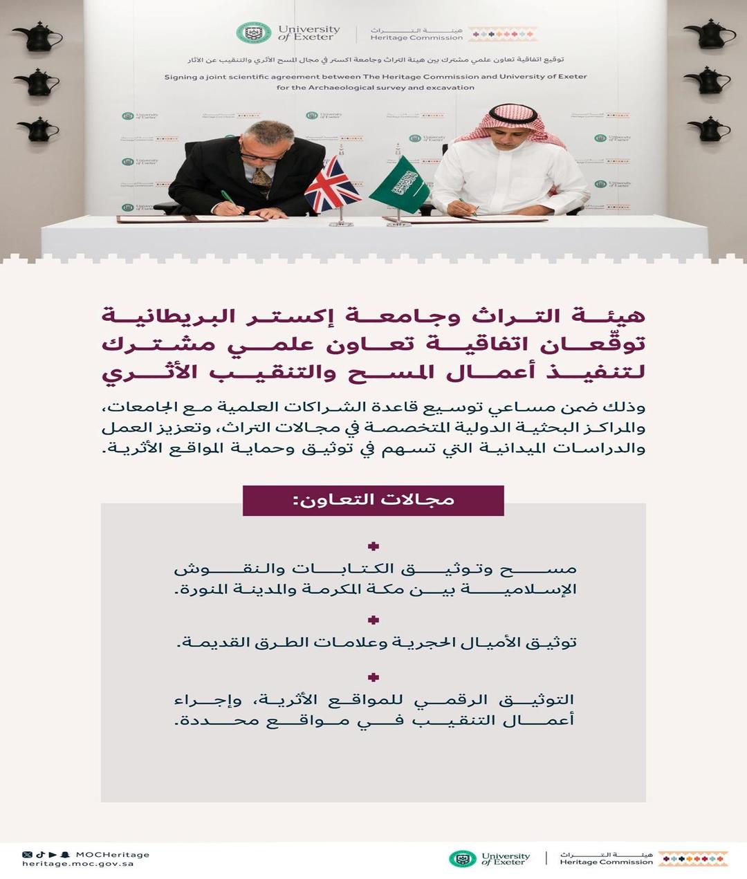 آخر الأخبار > هيئة التراث توقّع اتفاقية تعاون مع جامعة إكستر البريطانية لتنفيذ أعمال المسح والتنقيب الأثري على طريق الحج التاريخي > JcNpClEdF3BXc5xbOJbgZ62jkvXV99GHGWy8bvhS