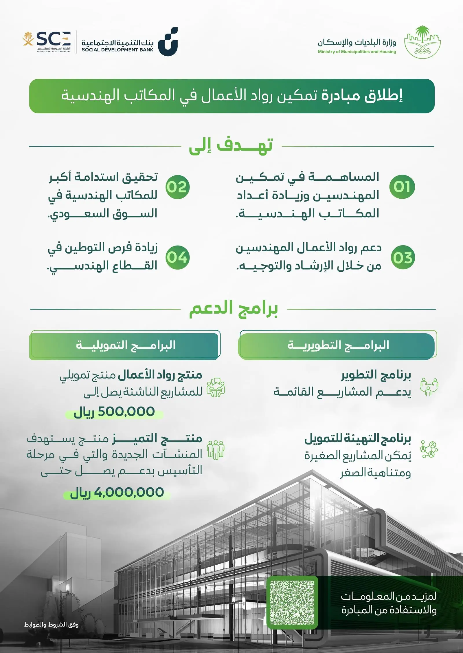 وتأتي هذه الخطوة ضمن الجهود الرامية إلى تطوير القطاع الهندسي وتمكين العاملين فيه، ورفع مستوى التوطين من خلال توفير بيئة محفزة وممكنة للمكاتب الناشئة والمهندسين السعوديين، وتقديم الدعم للمهندسين الراغبين في تأسيس أو تطوير مكاتبهم الهندسية، من خلال توفير التمويل والتدريب والإرشاد المناسب، بما يعزز قدراتهم ويُمكنهم من دخول السوق بكفاءة واستدامة.