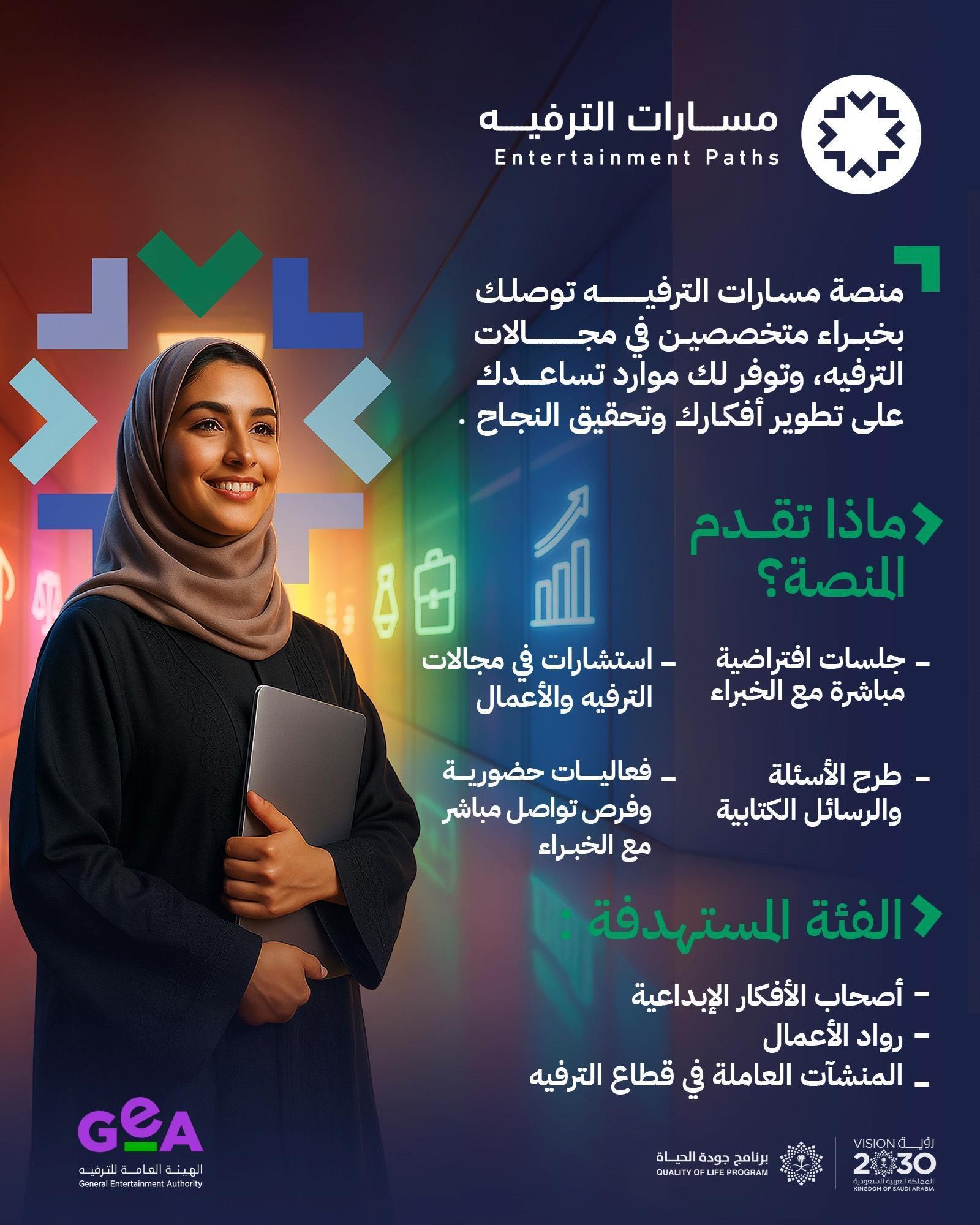 أطلقت الهيئة العامة للترفيه (GEA) اليوم، مشروع مسارات الترفيه، بصفتها مبادرة نوعية تهدف إلى دعم وتمكين رواد الأعمال في قطاعات الترفيه والأعمال المرتبطة بها، وذلك من خلال توفير منصة رقمية شاملة تتيح لأصحاب المشاريع الناشئة والقائمة التواصل المباشر مع نخبة من الخبراء والمتخصصين في مجالات متنوعة.
