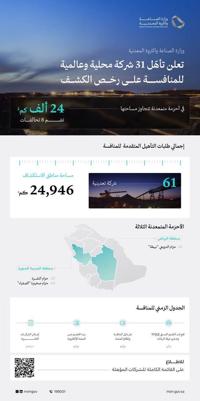 أعلنت وزارة الصناعة والثروة المعدنية تأهل (31) شركة محلية وعالمية للمنافسة على رخص الكشف في ثلاثة أحزمة متمعدنة جديدة بالمملكة تغطي مساحتها (24,423) كيلومترًا مربعًا، بعد اجتيازها مرحلة التأهيل المسبق التي شهدت تنافس (61) شركة، وذلك في إطار جهود الوزارة لتسريع وتيرة الاستكشاف التعديني بالمملكة.
