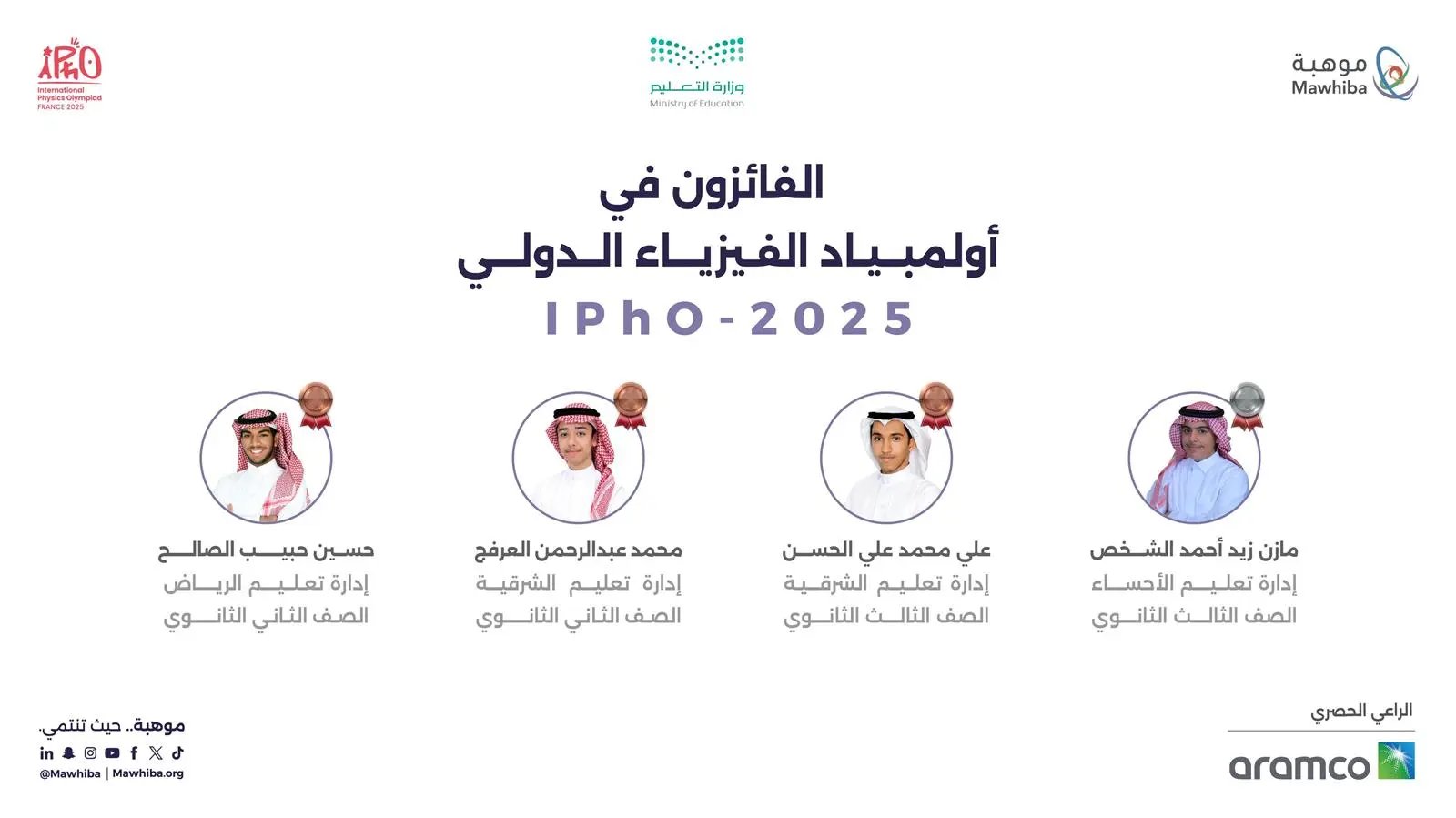 وجاءت هذه النتائج المشرّفة لطلبة المملكة ثمرة لتأهيلهم عبر آلاف الساعات التدريبية من قبل مؤسسة الملك عبدالعزيز ورجاله للموهبة والإبداع “موهبة”، بالشراكة الإستراتيجية مع وزارة التعليم، وبدعم من الراعي الحصري شركة أرامكو السعودية.