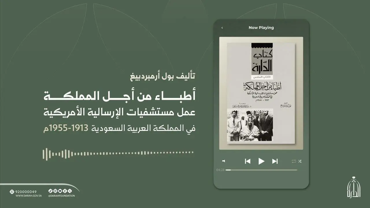وفي أحدث إصداراتها الصوتية، طرحت الدارة كتابًا بعنوان “أطباء من أجل المملكة: عمل مستشفيات الإرسالية الأمريكية في المملكة العربية السعودية 1913–1955م”، وهو عمل توثيقي يسلّط الضوء على الجهود الطبية الأمريكية في بدايات تأسيس الدولة السعودية الحديثة، ودورها في تقديم خدمات الرعاية الصحية بتوجيه من الملك عبدالعزيز -رحمه الله- في عدد من المدن السعودية، وذلك ضمن سياق تاريخي موثق، ومنظور علمي رصين.