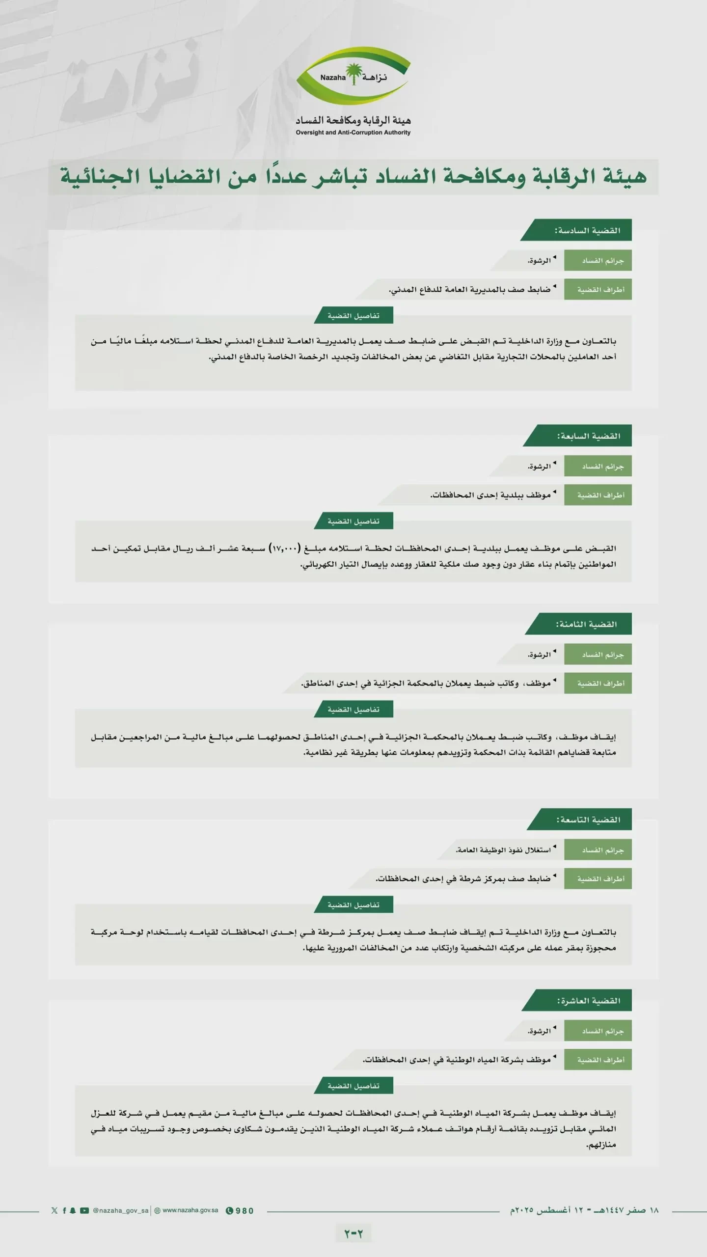 صرّح المتحدث الرسمي في هيئة الرقابة ومكافحة الفساد بأن الهيئة باشرت عددًا من القضايا الجنائية خلال الفترة الماضية، وجارٍ استكمال الإجراءات النظامية بحق مرتكبيها، وكانت أبرز القضايا على النحو الآتي: