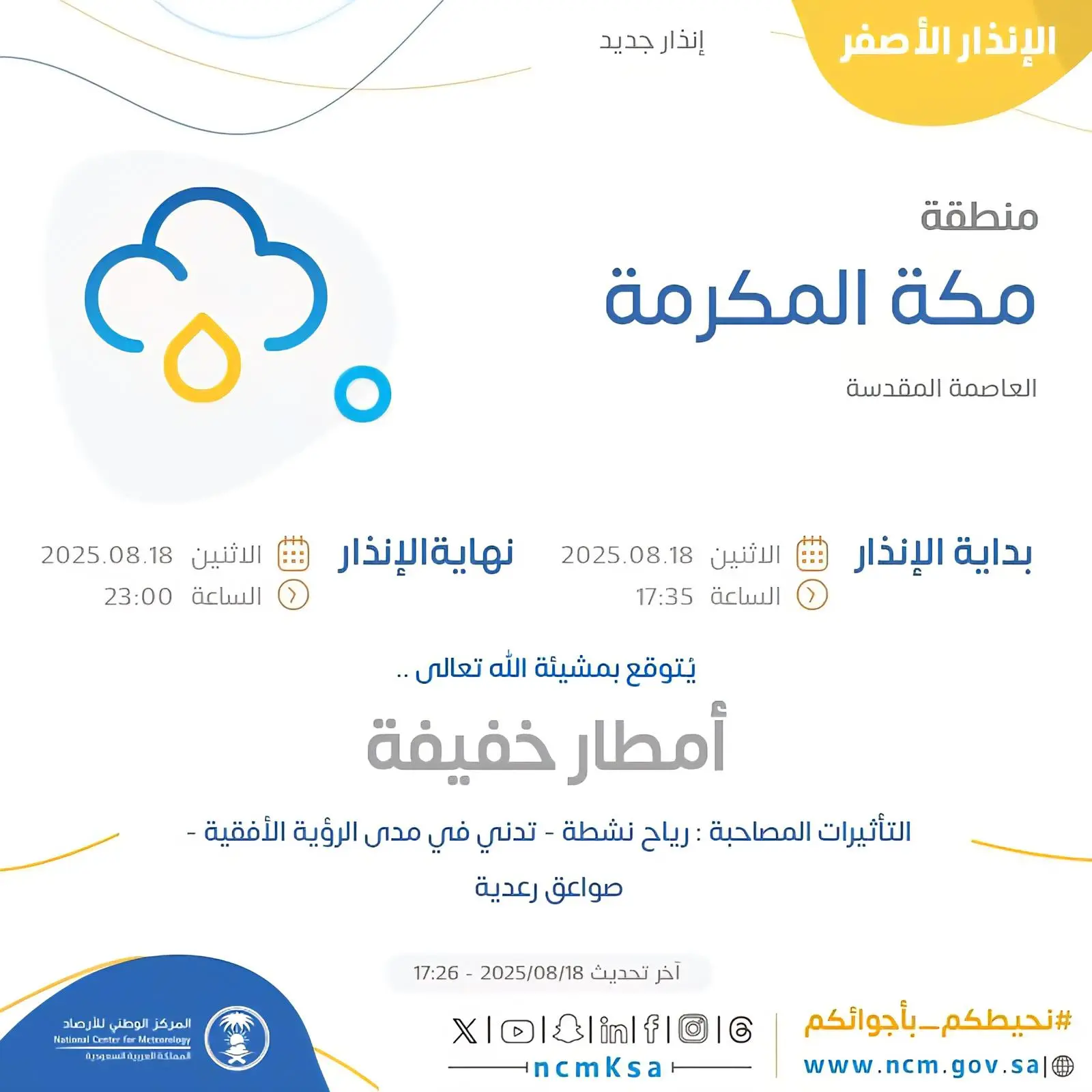 نبه المركز الوطني للأرصاد اليوم، من هطول أمطار خفيفة على العاصمة المقدسة، تشمل تأثيراتها المصاحبة رياحًا نشطة، وتدنّيًا في مدى الرؤية الأفقية، وصواعق رعدية.