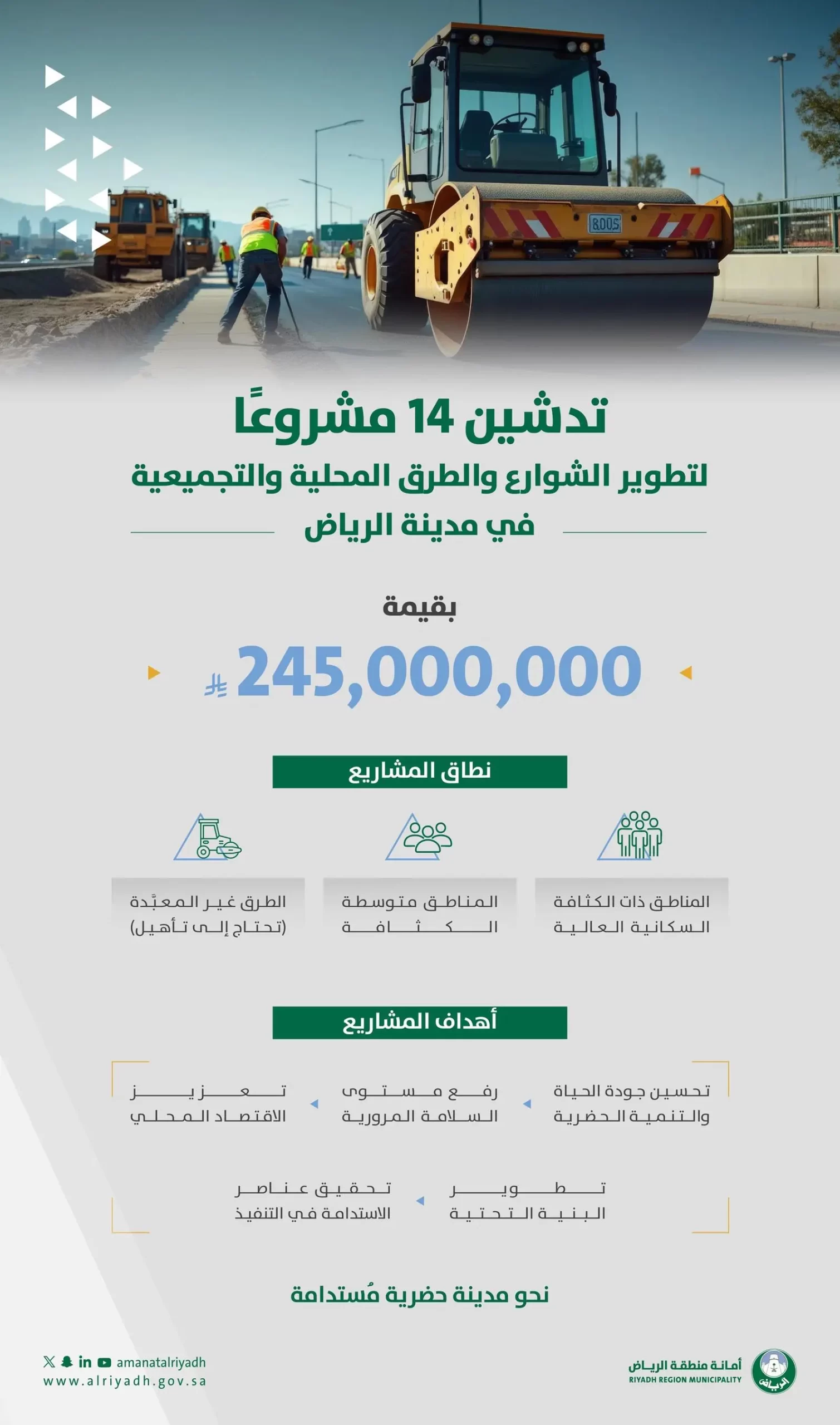 أمانة الرياض تنفذ 14 مشروعًا لتطوير الشوارع والطرق المحلية والتجميعية في مختلف نطاقات العاصمة