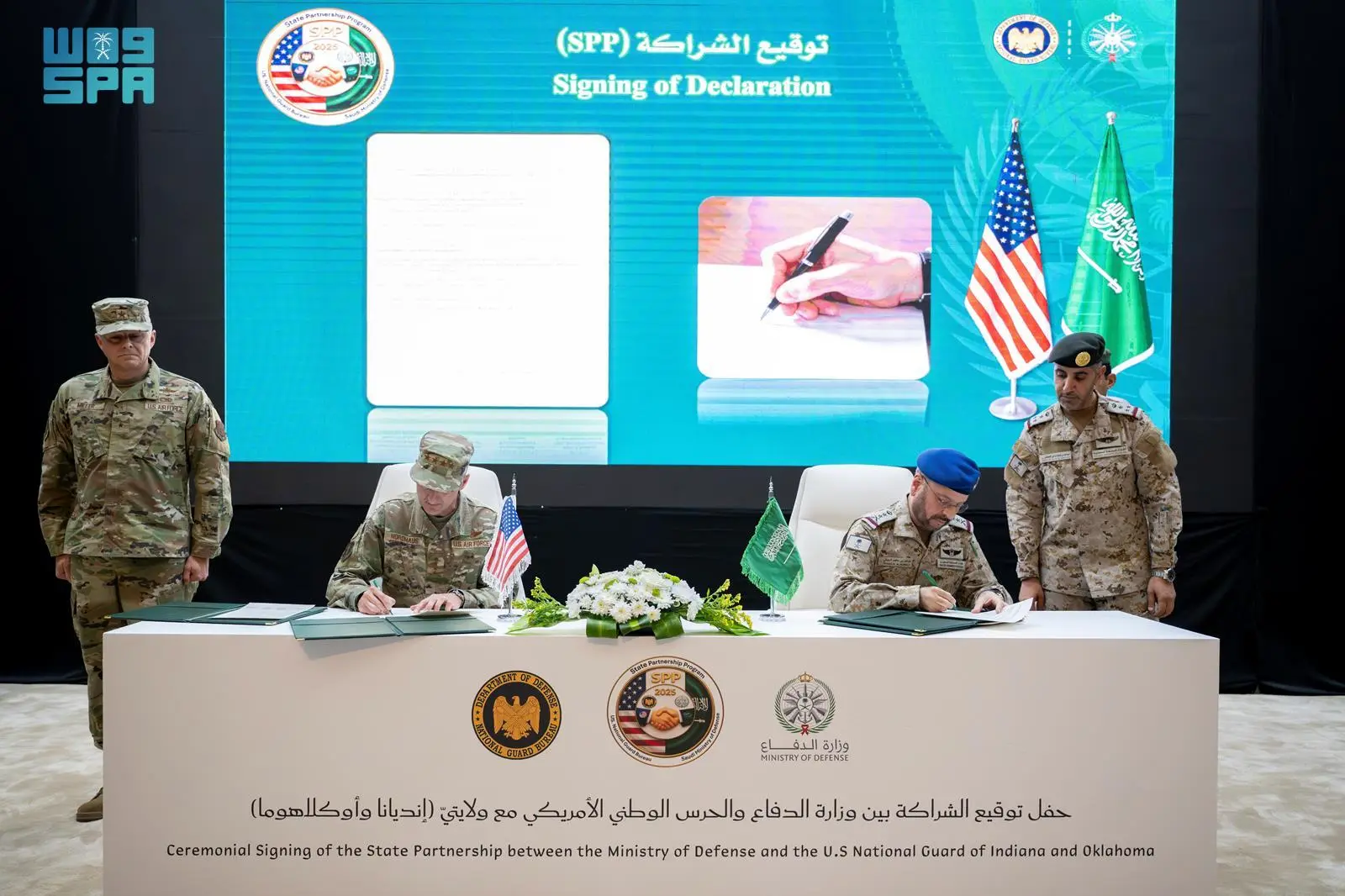 وقّعت وزارة الدفاع، اليوم، اتفاقية شراكة عسكرية مع الحرس الوطني الأمريكي لولايتي إنديانا وأوكلاهوما، وذلك خلال مراسم أُقيمت في نادي ضباط القوات المسلحة بالرياض، بحضور عدد من كبار المسؤولين من الجانبين، وبمشاركة مسؤولين من وزارة الداخلية ووزارة الحرس الوطني السعودي.