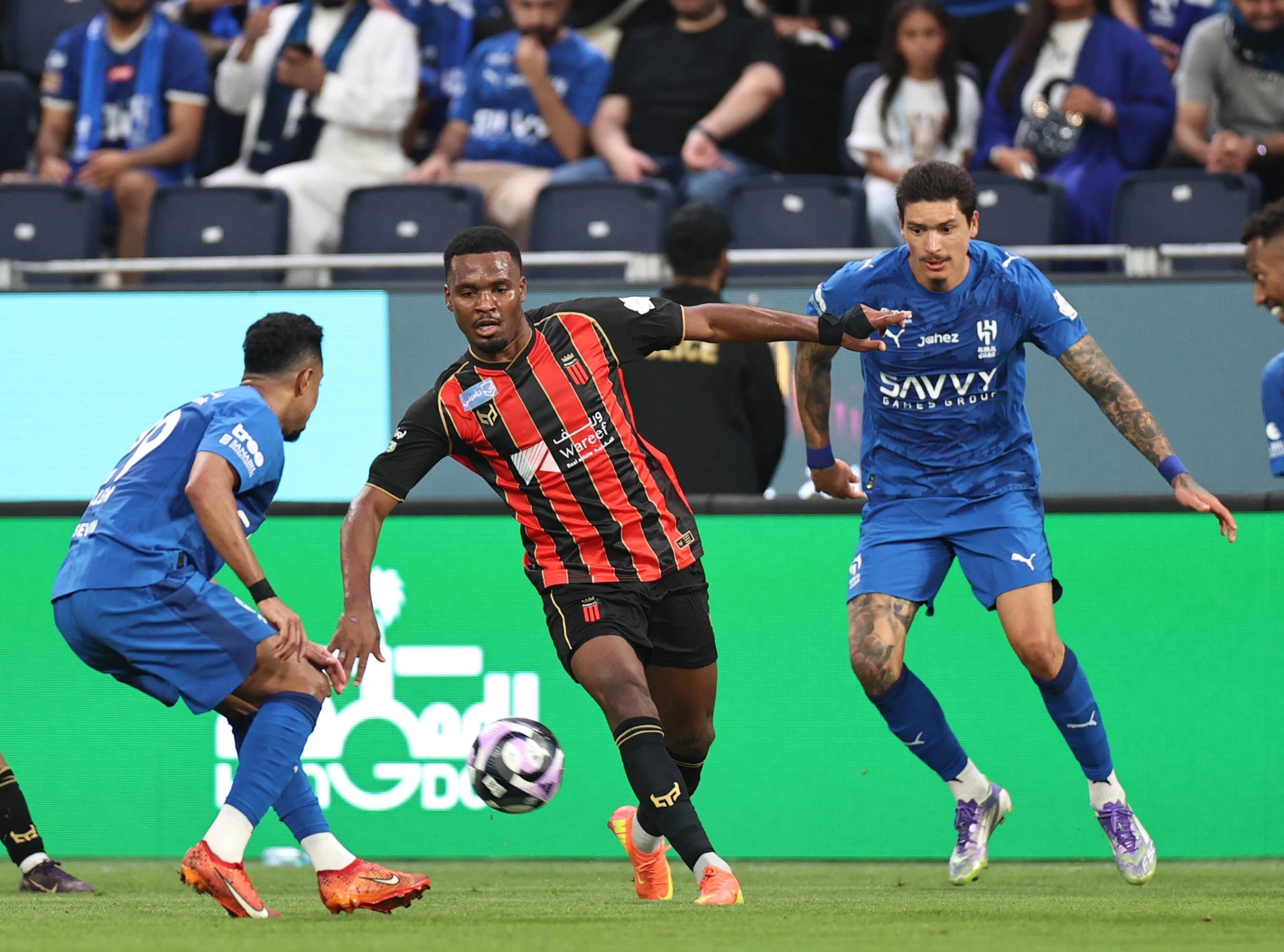 وجاء الهدف الأول للهلال في الدقيقة 22 عبر اللاعب متعب الحربي، قبل أن يضيف البرازيلي مالكوم الهدف الثاني في الدقيقة 45+3، لينهي الزعيم الشوط الأول متفوقًا بثنائية نظيفة.