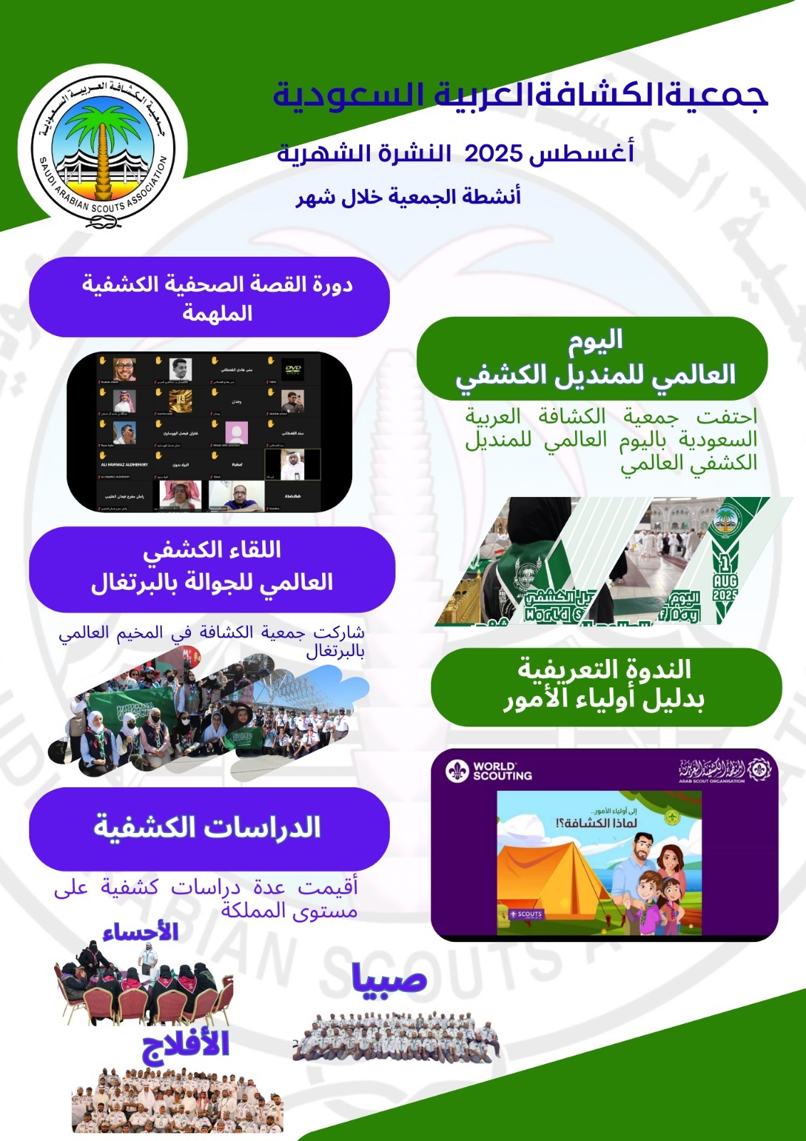 كشف تقرير إعلامي صادر عن أمانة جمعية الكشافة العربية السعودية عن تنفيذ ومشاركة الأمانة خلال شهر أغسطس 2025 في عدداً من الفعاليات والبرامج المتنوعة والمناسبات على المستويين المحلي والدولي.