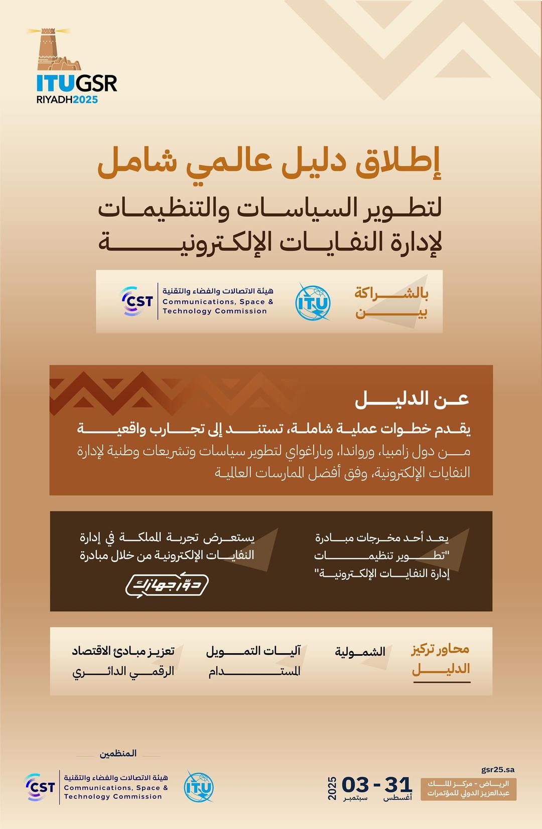 أعلنت هيئة الاتصالات والفضاء والتقنية، بالشراكة مع الاتحاد الدولي للاتصالات، عن إطلاق “دليل عالمي شامل لتطوير السياسات والتنظيمات الإلكترونية لإدارة النفايات الإلكترونية”؛ والذي يهدف إلى دعم الجهات الحكومية في الدول النامية لتطوير سياسات وتشريعات وطنية لإدارة النفايات الإلكترونية، وفق أفضل الممارسات العالمية، وذلك بالتزامن مع استضافة المملكة للندوة العالمية لمنظمي الاتصالات GSR25.