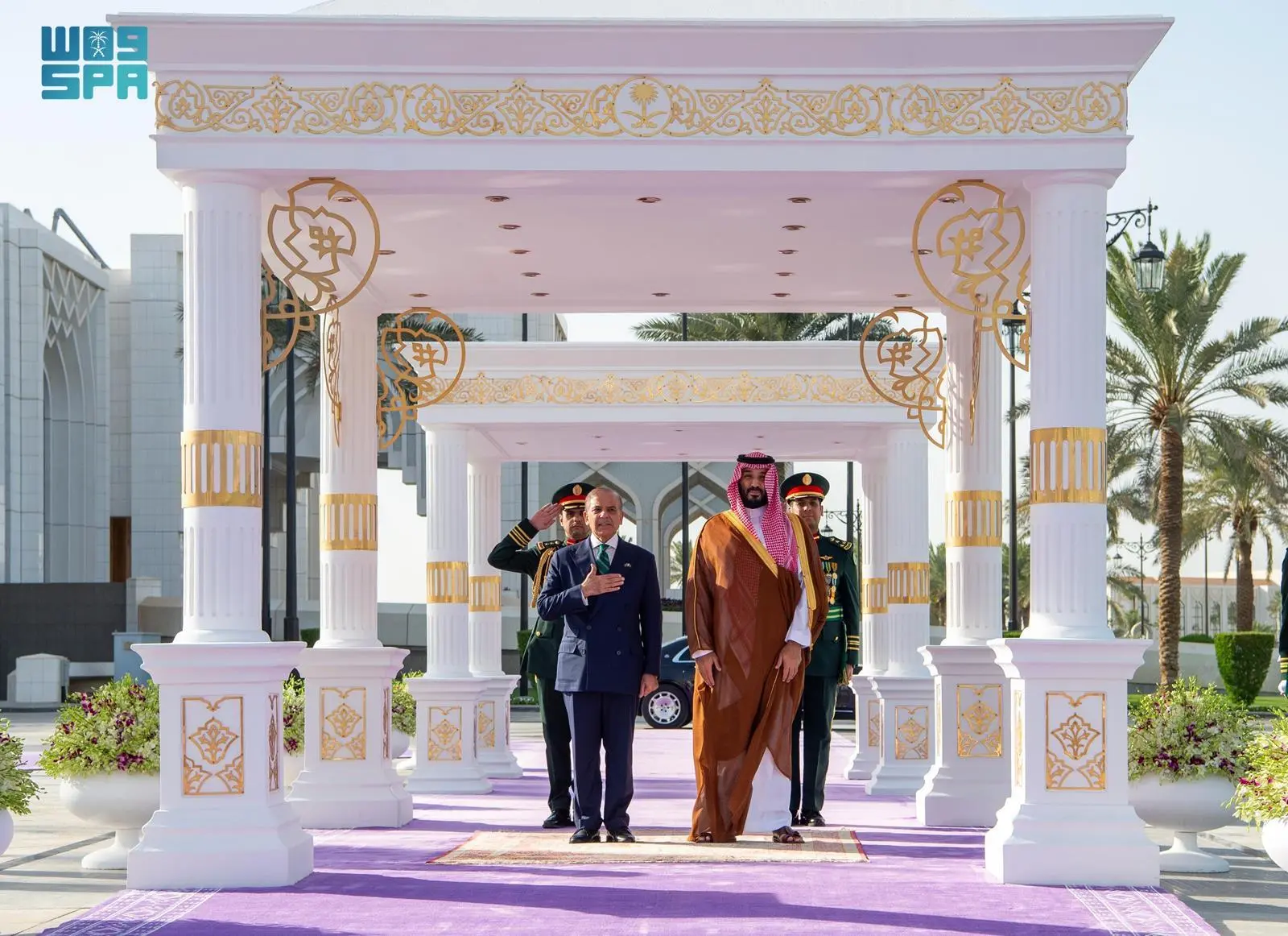 وعقد صاحب السمو الملكي الأمير محمد بن سلمان بن عبدالعزيز آل سعود ولي العهد رئيس مجلس الوزراء ودولة السيد محمد شهباز شريف رئيس وزراء جمهورية باكستان الإسلامية جلسة مباحثات رسمية، استعرضا خلالها العلاقات الثنائية الوثيقة بين المملكة العربية السعودية وجمهورية باكستان الإسلامية، والجهود التنسيقية لتعزيز أوجه الشراكة الإستراتيجية بين البلدين الشقيقين في مختلف المجالات، إلى جانب بحث تطورات الأوضاع الإقليمية والدولية والقضايا ذات الاهتمام المشترك والجهود المبذولة تجاهها، بما يحقق الأمن والاستقرار.
