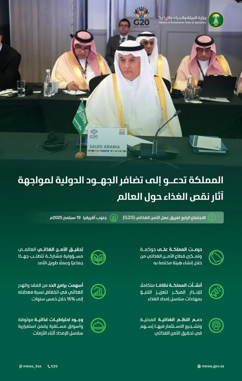 جاء ذلك خلال كلمة معالي وزير البيئة والمياه والزراعة المهندس عبدالرحمن بن عبدالمحسن الفضلي، في الاجتماع الرابع لفريق عمل الأمن الغذائي، ضمن الاجتماع الوزاري للوزراء المسؤولين عن الأمن الغذائي في مجموعة العشرين، الذي عُقد في جمهورية جنوب أفريقيا.